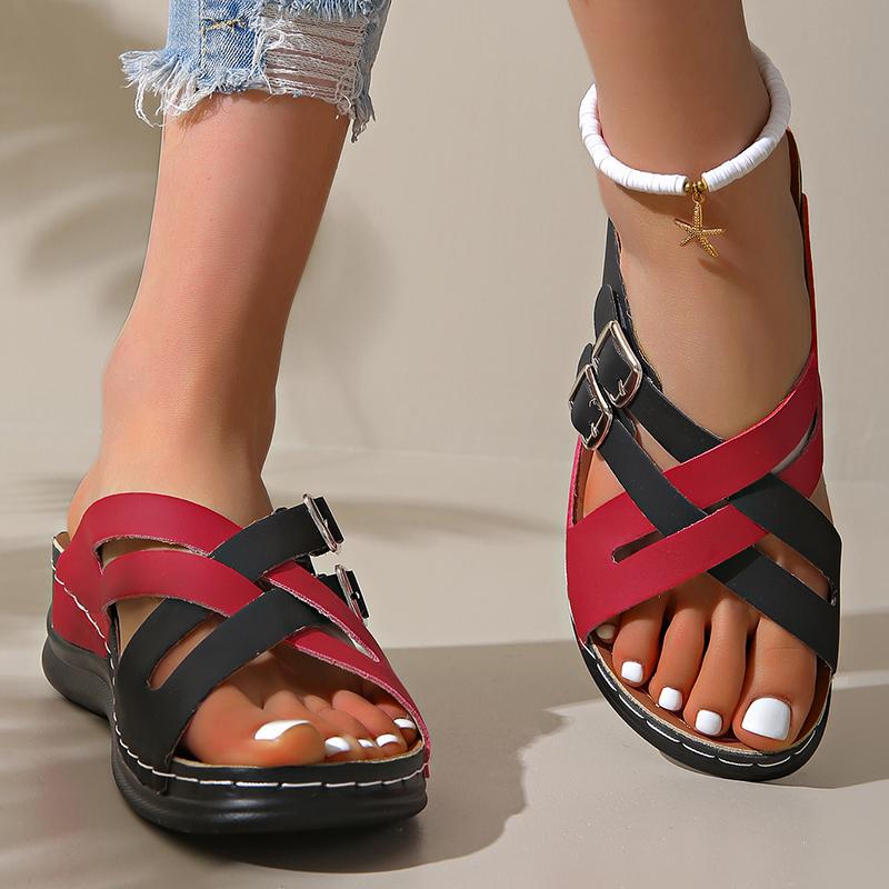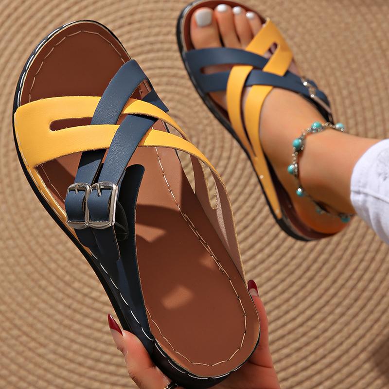Разноцветные босоножки на танкетке с перекрестными ремешками для женщин, лето 2025 г., удобная нескользящая пляжная обувь, женские тапочки на платформе с двумя пряжками