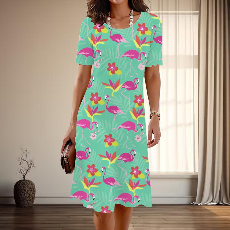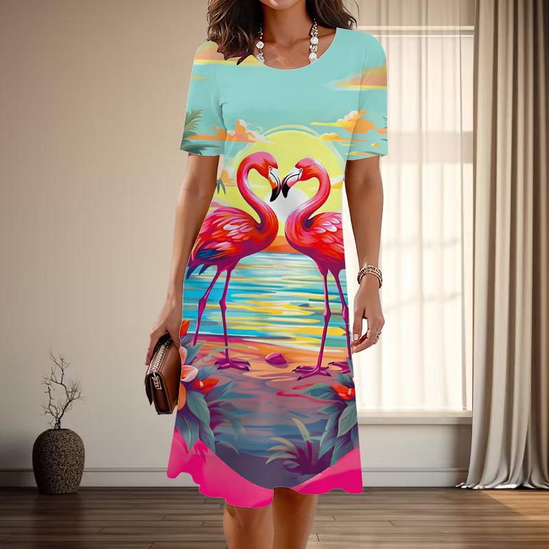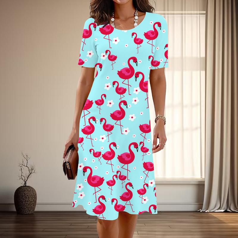 Женская мода изящный фламинго принт лето весна короткий рукав О-образный вырез повседневные платья