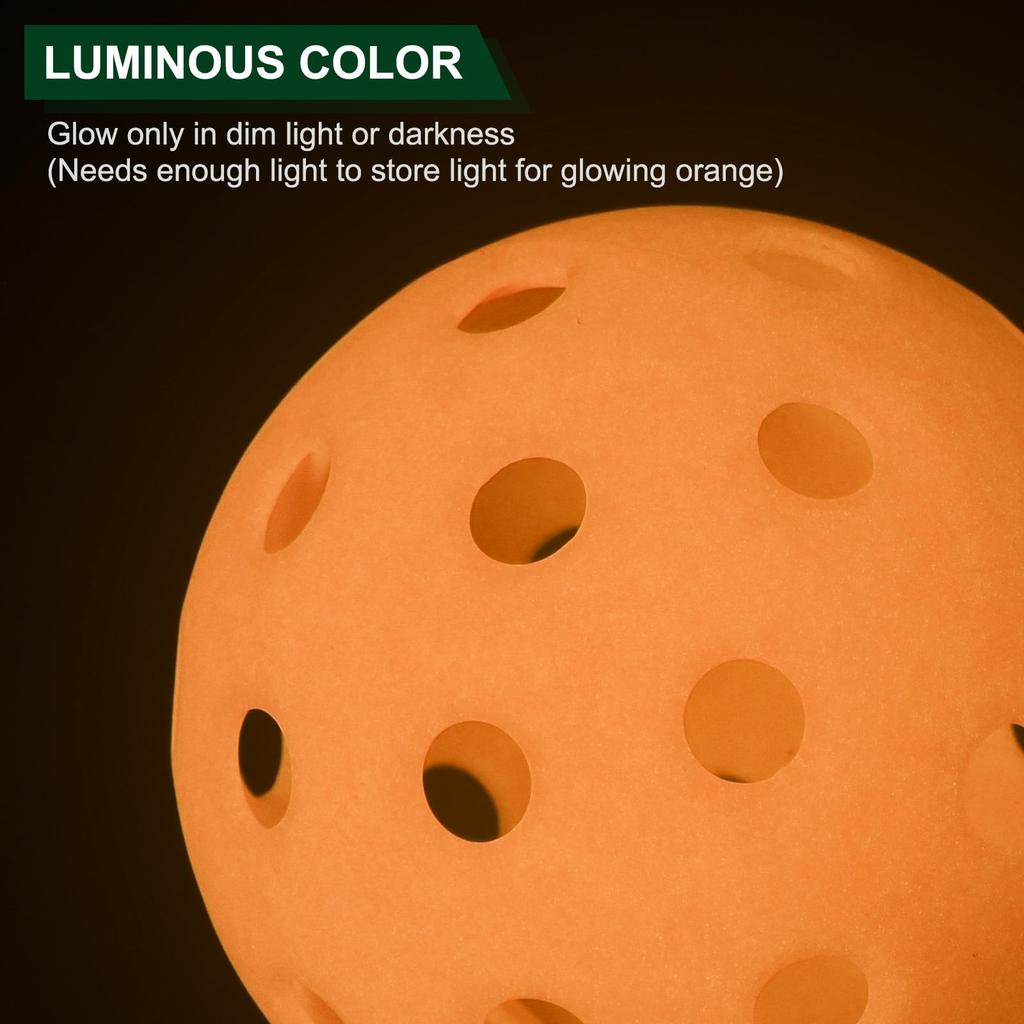 6 светящихся в темноте шариков с переносной сетчатой сумкой. Эти светящиеся в темноте шарики из солений будут светиться в темноте при воздействии прямых солнечных лучей или яркого комнатного освещения в течение 15 минут.. Мы даже можем заряжать мяч во время обычной дневной игры, особенно под прямыми солнечными лучами! (должен получать много света), что делает его отличным выбором для ночной игры. Характеристики Pickleball Диаметр 74 мм (0.92") и вес 26 граммов (0,92 унции), Pickleball соответствует стандартам, утвержденным USA Pickleball, и подходит по конструкции, размеру, весу и жесткости отскока, что делает его пригодным для игроков любого уровня мастерства.. И разработан с использованием привлекательных ярких цветов.. Уличный пиклбол легко найти и быстро попасть на площадку в любое время дня и ночи.. Использование Мячи Pickleball подходят для использования профессиональными и любительскими игроками на тренировках и в спорте.. Широко используется для внутреннего и наружного применения дома, в саду, парке, на стадионе, детской игровой площадке и т. д.
