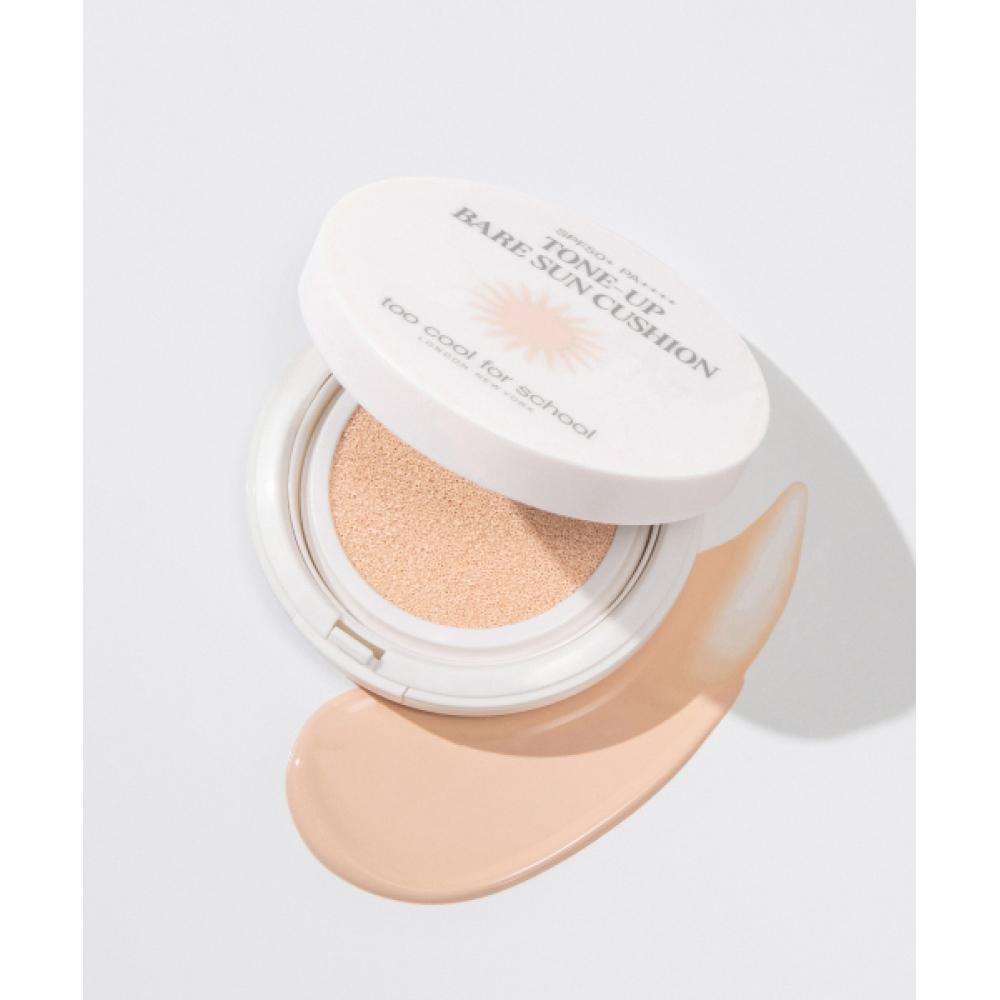 TOO COOL FOR SCHOOL Tone Up Bear Sun Cushion (SPF50+ PA++++) is a 24-hour tone-up sun cushion with powerful UV protection. It brightens the skin with a glowing peach tint and provides a light texture for a natural, fresh finish. This product allows for both base makeup and UV protection simultaneously, making it convenient for outdoor use.