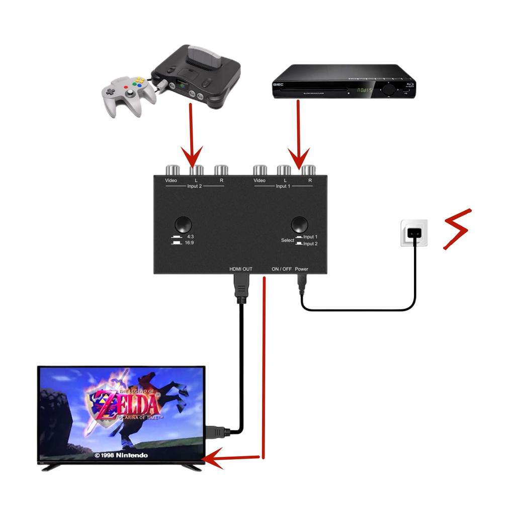 Конвертер 2RCA в HDMI. Совместим с Sega, WII, N64, NGC, SNES, PS1, PS2, PS3, Xbox, STB, VHS, видеомагнитофонами, DVD-плеерами, телевизорами, проекторами и т. д.
