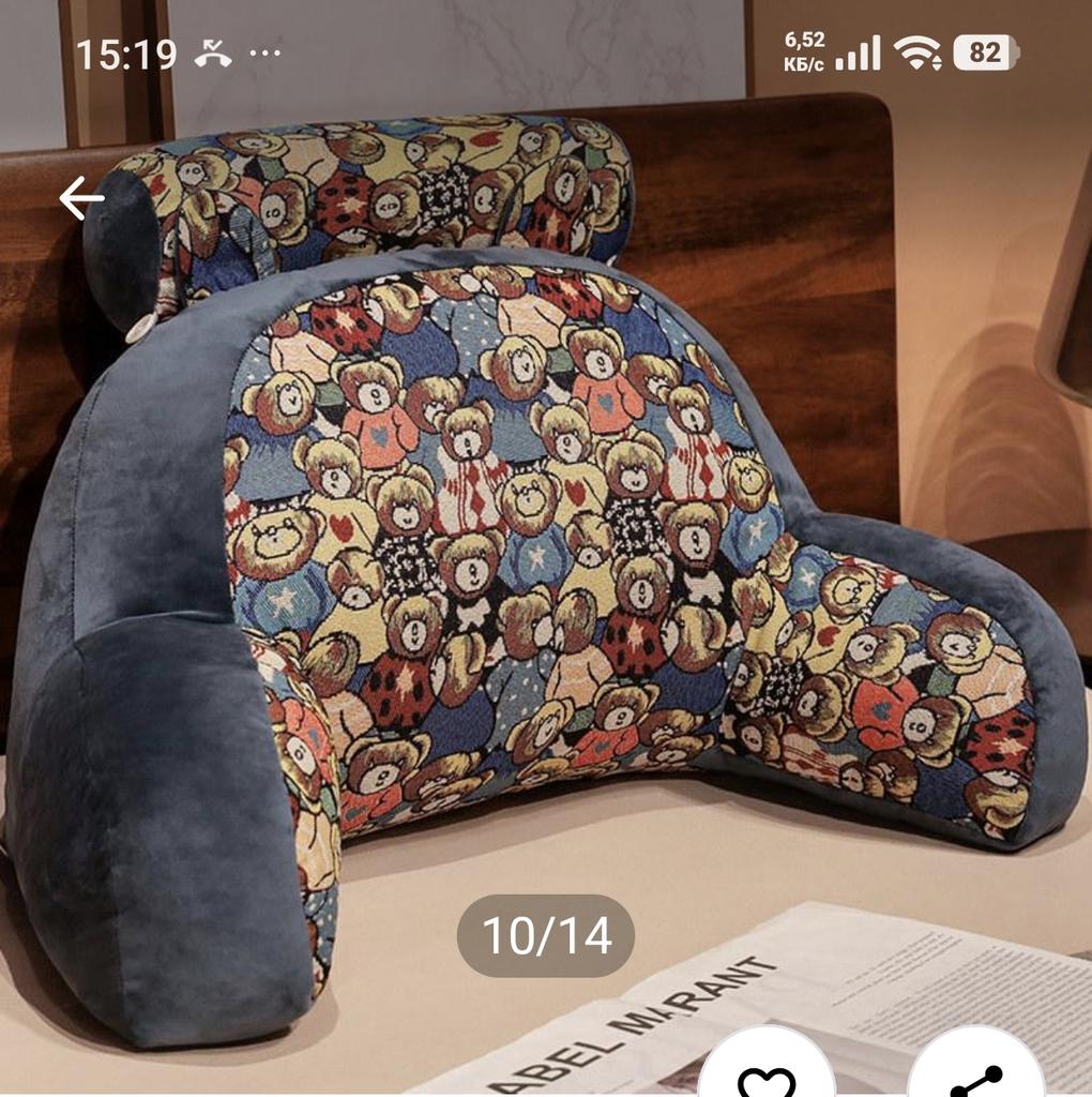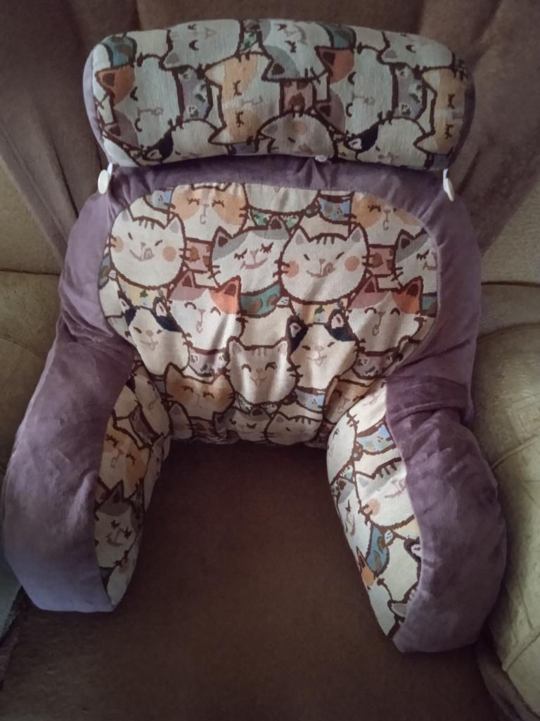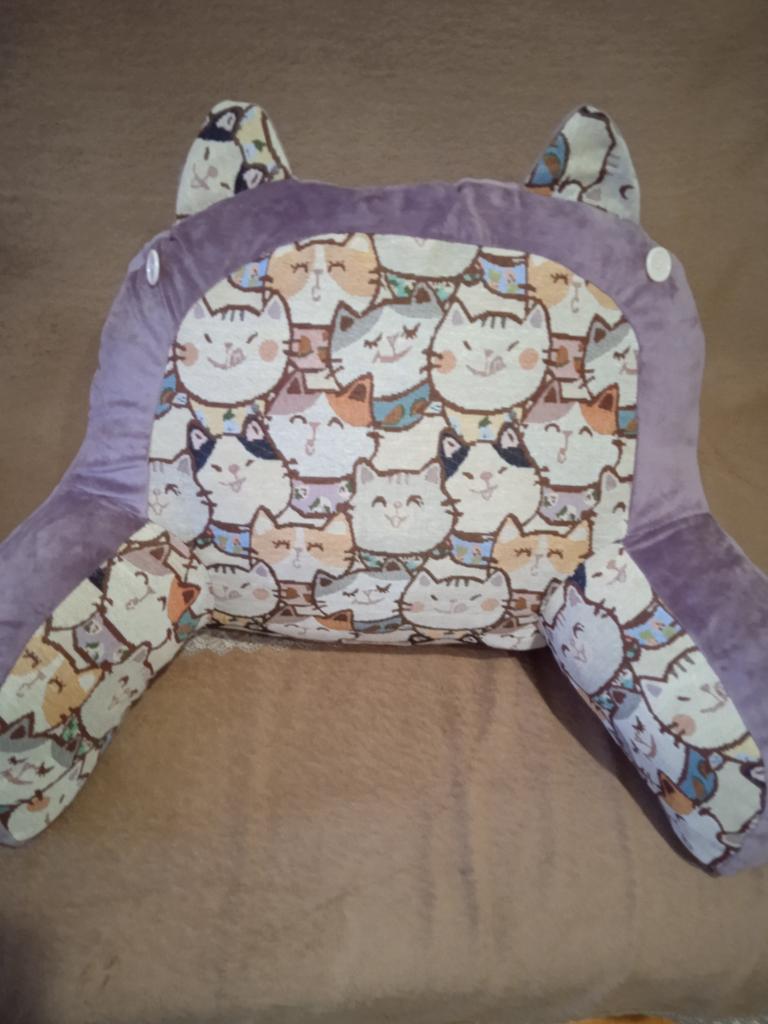 Большая жаккардовая подушка. Мягкая, удобная для сидения, поместиласть точно в кресло. У продавца подушка нескольких расцветок. Выбрали с котиками. Подушка состоит из двух частей: подголовник и основная часть. Соединяются при помощи 2 пуговиц. Чехлы снимаются, они застегиваются на молнию. Наполнитель подушки - холофайбер. Спасибо продавцу и всем кто занимался её доставкой. Рекомендую.