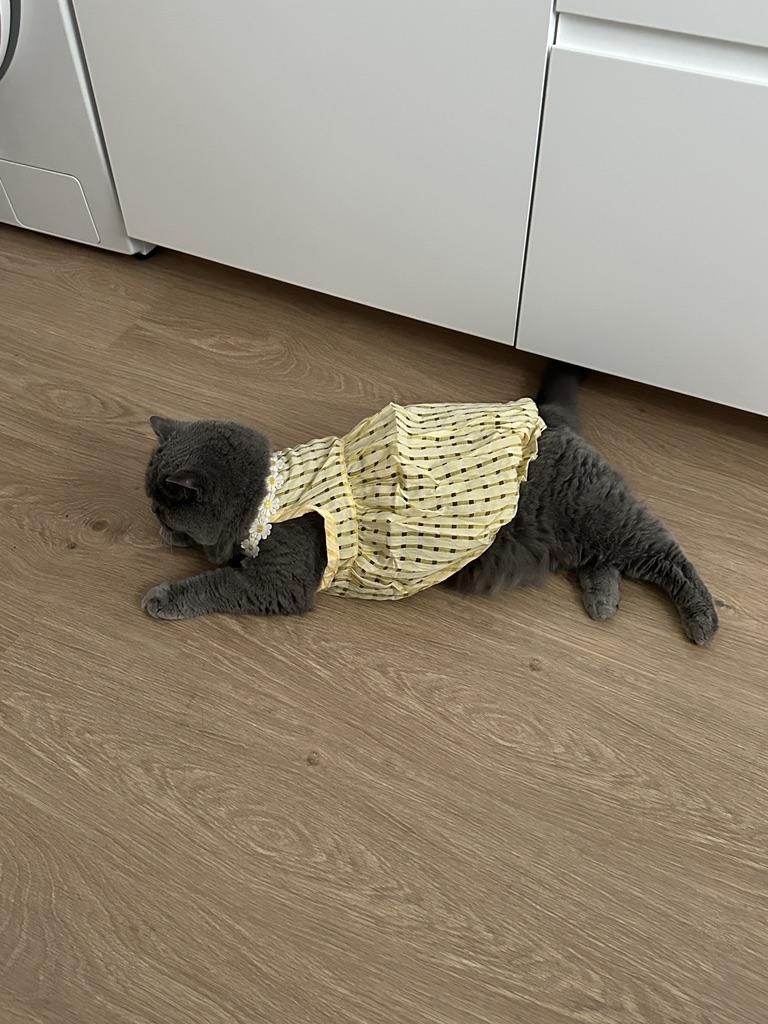 Думала, что платье без резинки, но резинка есть, немного впивается в пузико кошки, поэтому надели для фото и сняли 😀