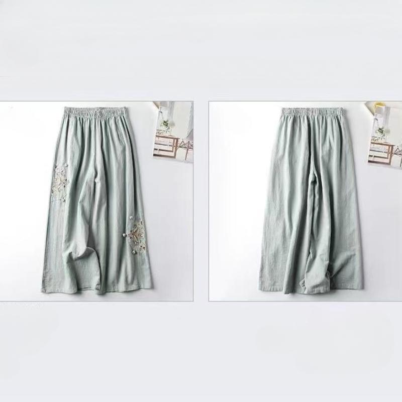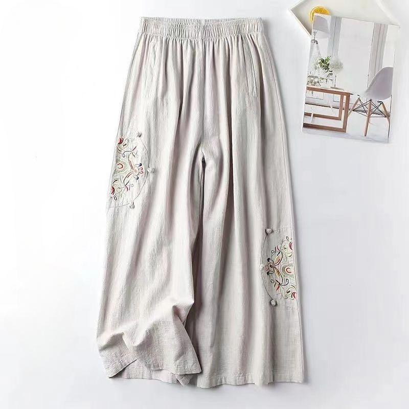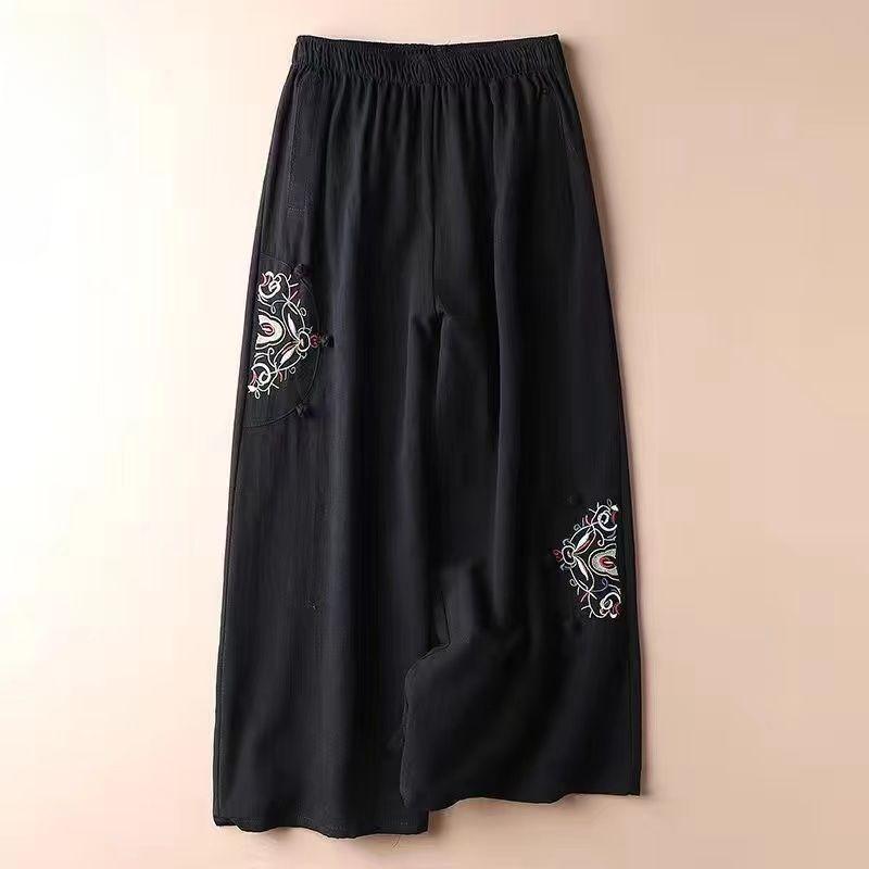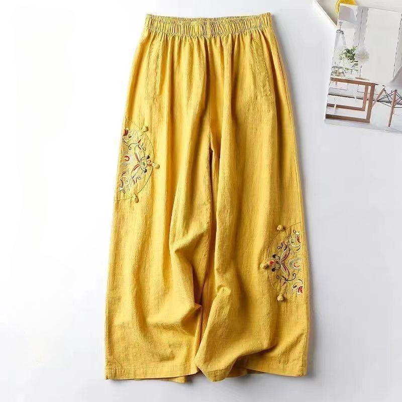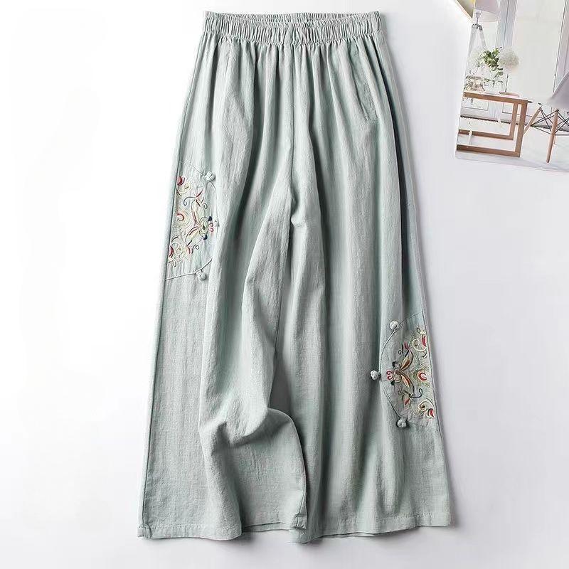 Летние новые женские повседневные широкие брюки из хлопка и льна, большие размеры, эластичный пояс, вышивка, длинные брюки до щиколотки, M-3XL
