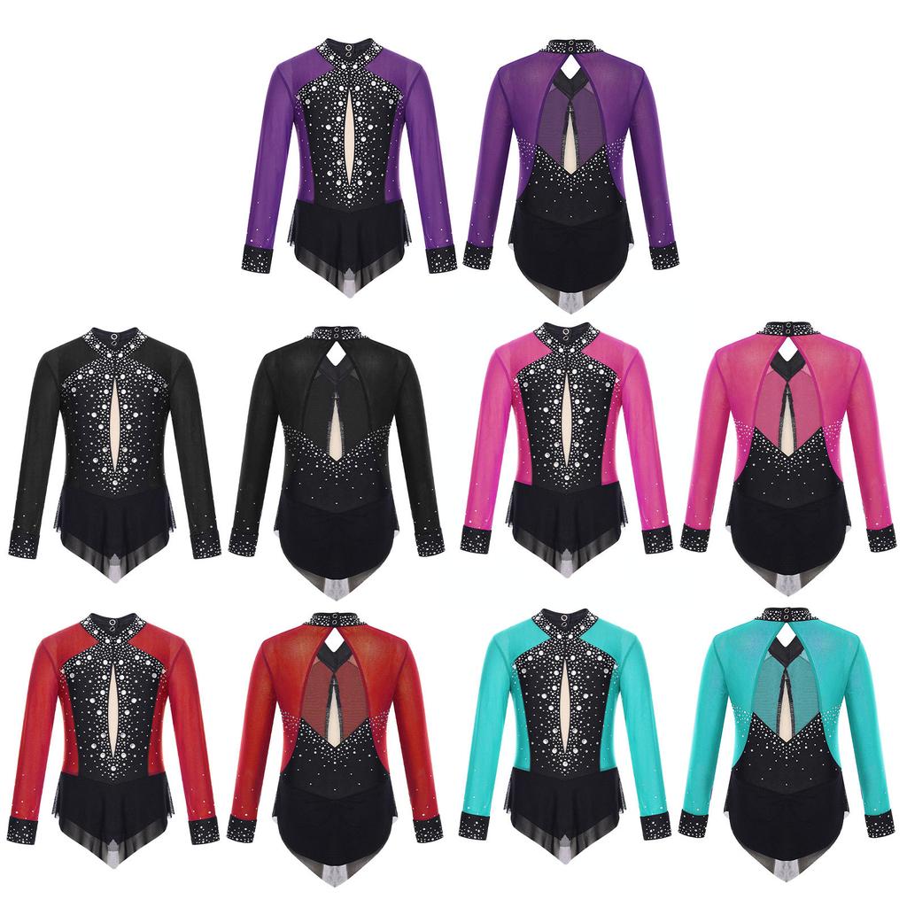 Купальник с блестящими стразами для девочек, цветной блок, прозрачная сетка, лоскутное боди с юбкой, танцевальное платье для фигурного катания, гимнастики, трико