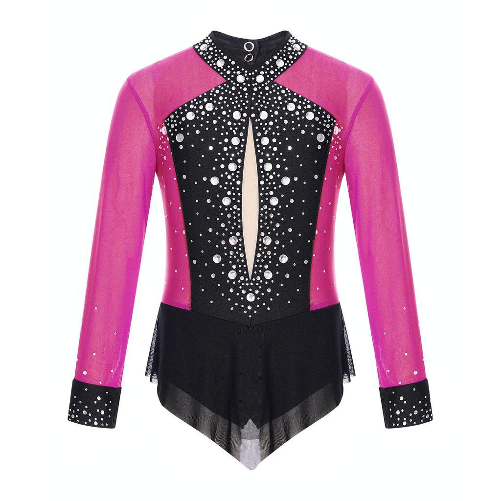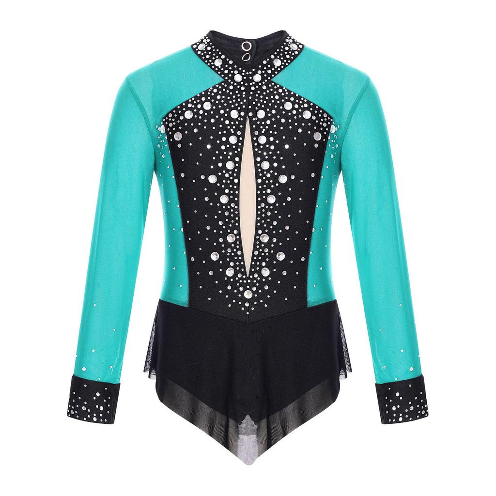 Детский купальник для девочек с цветными блоками, прозрачная сетка, блестящие стразы, гимнастический танцевальный боди, комбинезон