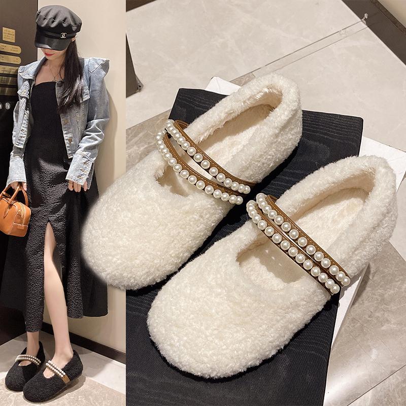 Круглый носок повседневные женские туфли лоферы меховые лодочки с коротким горлом новые осенние флокированные жемчужные пряжки повседневные резиновые однотонные Mary