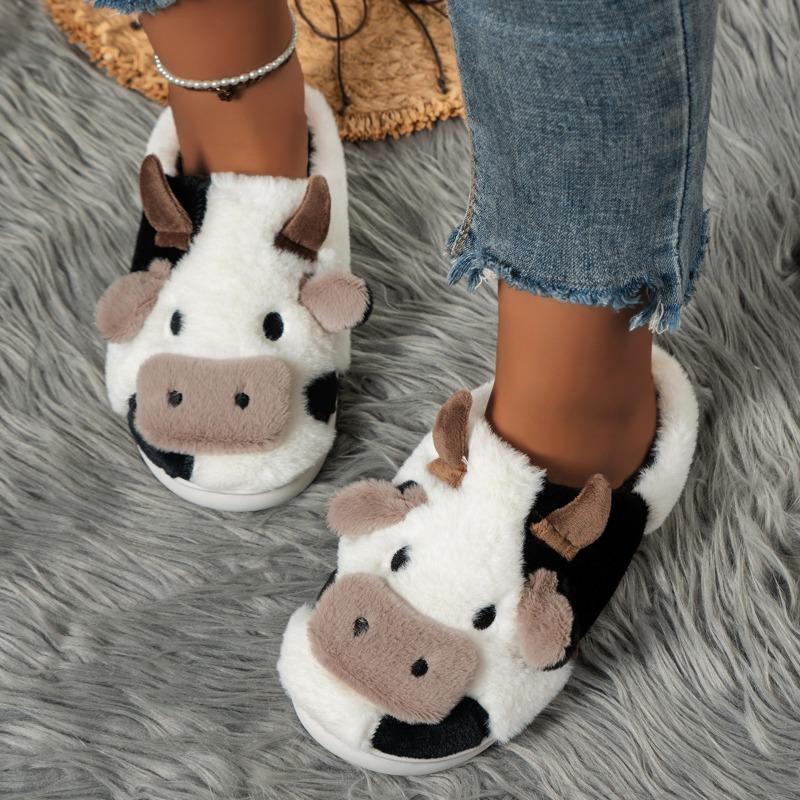 2024 Новые зимние женские тапочки с рисунком коровы из мультфильма, теплые плюшевые тапочки для дома, нескользящие, женские тапочки из хлопка Баотоу для женщин