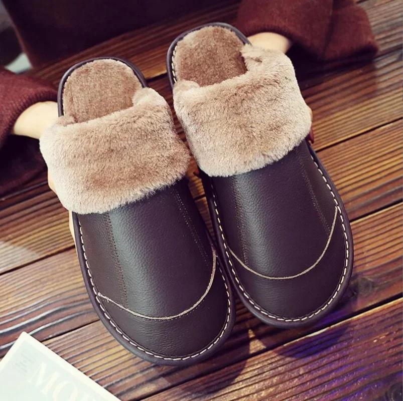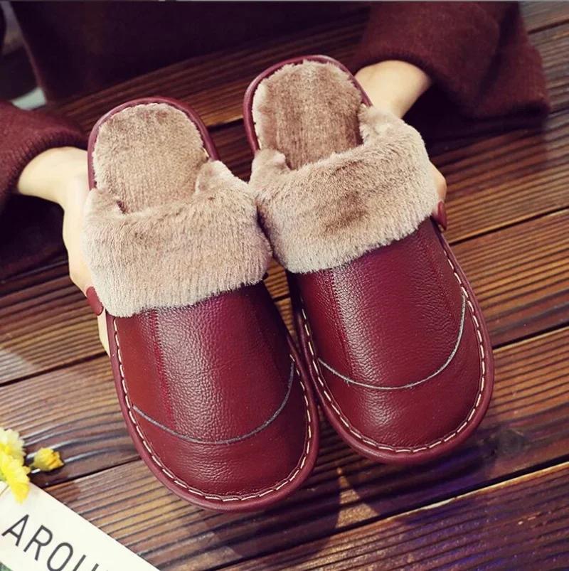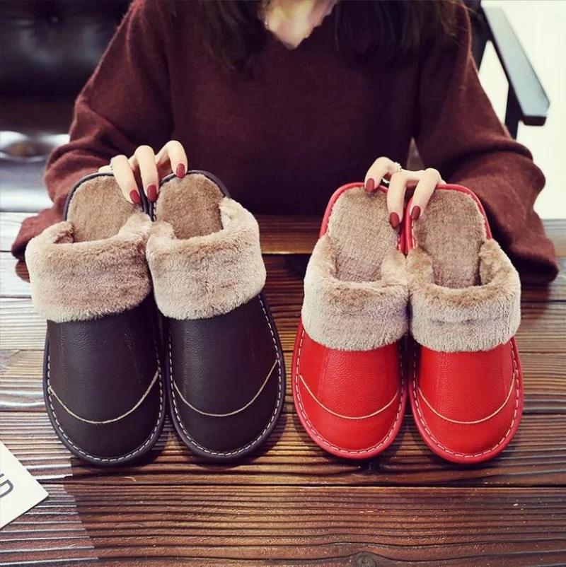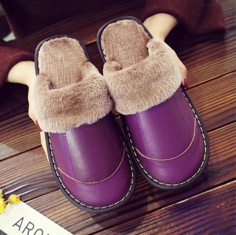 2024 женские зимние тапочки домашние спилковые кожаные водонепроницаемые хлопковые тапочки теплые домашние меховые парные нескользящие тапочки на платформе