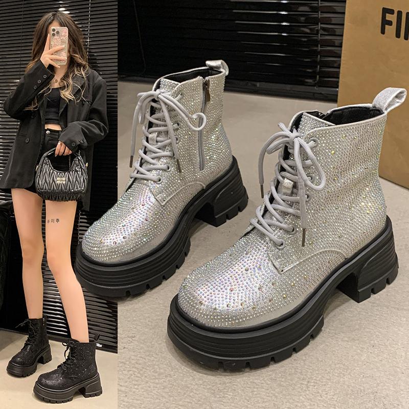 2024 Sequin Diamond Короткие сапоги Женские Осенне-Зимние Британские Модные Сапоги На Высоком Толстом Каблуке Ботинки На Шнуровке Повседневная Обувь Для Вечеринок На Открытом Воздухе — купить товар онлайн с бесплатной доставкой по всему миру!