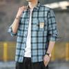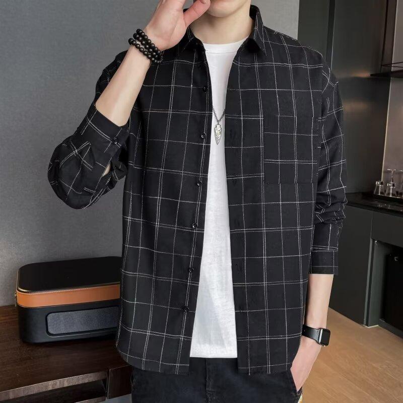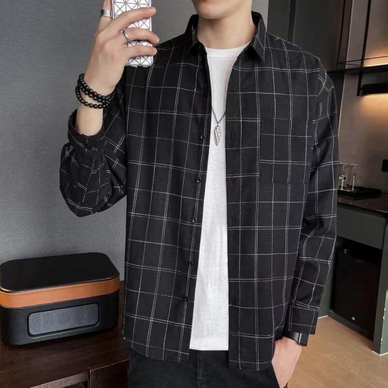 Весенне-осенний тип Новая мужская рубашка Приталенная Молодежная Однотонная Универсальная Рубашка с длинным рукавом Новая Клетчатая Рубашка