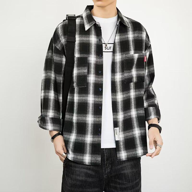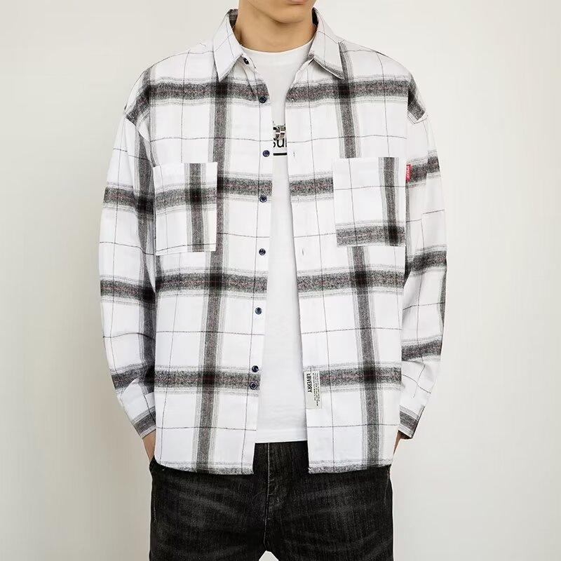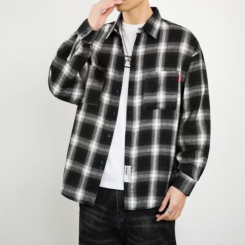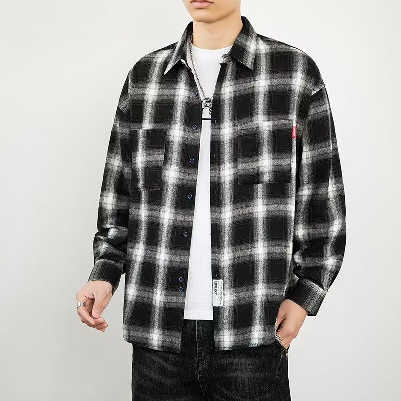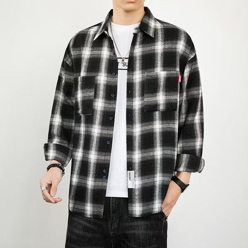 Personalized Double Pockets Fashion Trend Versatile Handsome Men's Plaid Shirt Black and White Shirt