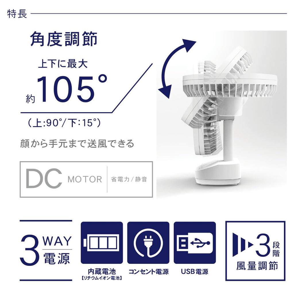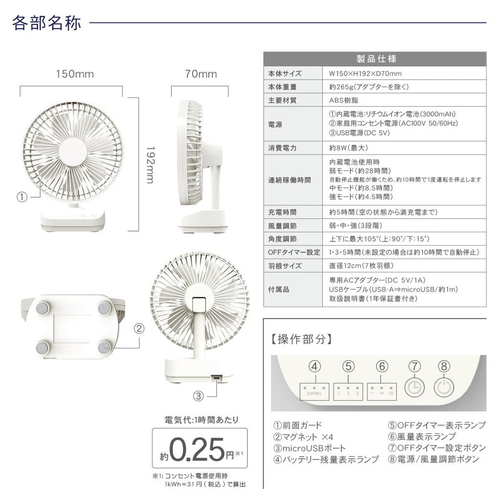 [Характеристики продукта] ◇Размер корпуса: Ширина 15 x Глубина 7 x Высота 19,2 см ◇Вес тела: 265 г ◇Блок питания: 100 В ◇Потребляемая мощность: 8W (максимум) ◇Регулировка угла: Вручную вверх и вниз до 105° (90° вверх/вниз 15°) ◇Регулировка объема воздуха: 3 уровня (слабый, средний, сильный) ◇Таймер выключения: 1, 3, 5 часов (автоматически выключается через 10 часов, если не установлено) ◇Продолжительность работы в беспроводном режиме: Слабо/приблизительно. 28 часов, средний/приблизительно. 8,5 часов, Высокий/приблизительно. 4,5 часа ◇Аксессуары: Специальный адаптер переменного тока, USB-кабель питания (длина шнура: приблизительно. 1m), Инструкция по эксплуатации (гарантия)