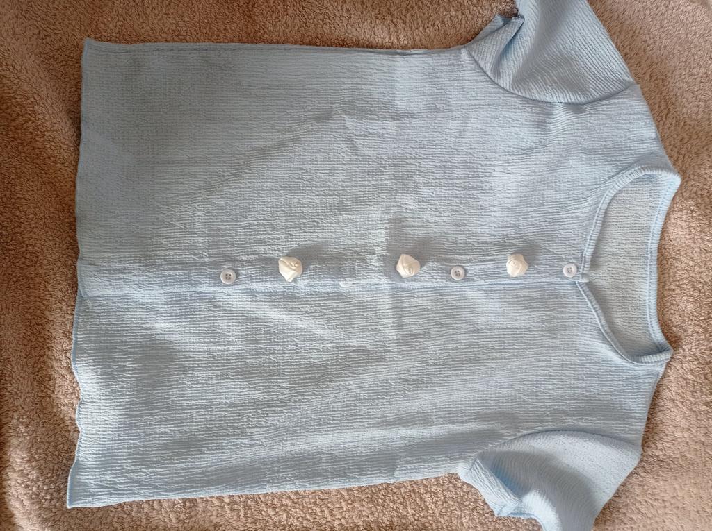 Комплект нарядный, поэтому синтетика особенно не испугала. Верх удлиненный, низ , по характеристике продавца, полуюбка ( верхний слой юбка, нижний лёгкие шорты, укороченный вариант - 32 см). Верх нежно - голубого цвета, смотрится эффектно - фото его искажает, к сожалению.