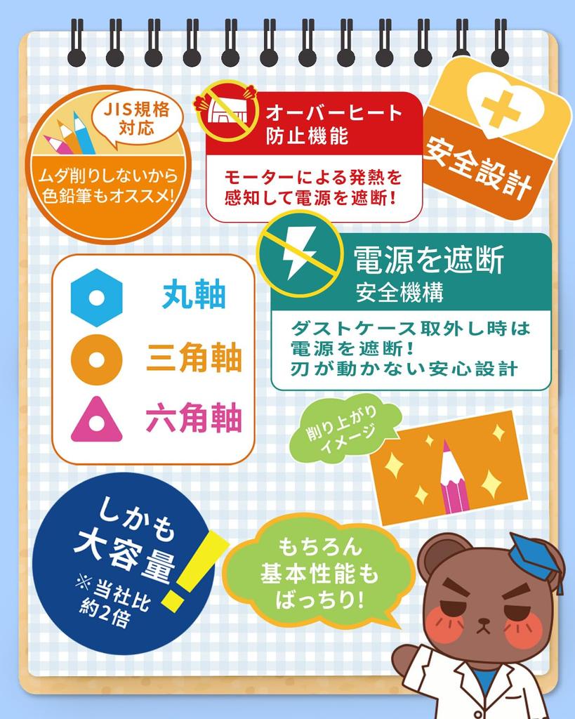 [Разработано с упором на безопасность] Оснащено отдельной конструкцией + функцией автоматической блокировки + функцией защиты от перегрева + защитой от отключения питания, оно разработано с учетом безопасности детей как главного фактора.. Когда вы открываете крышку и выбрасываете точилку, мотор автоматически выключается.. Вы можете чувствовать себя в безопасности, поскольку это предотвращает такие риски, как поражение электрическим током, неправильная эксплуатация и перегрев!