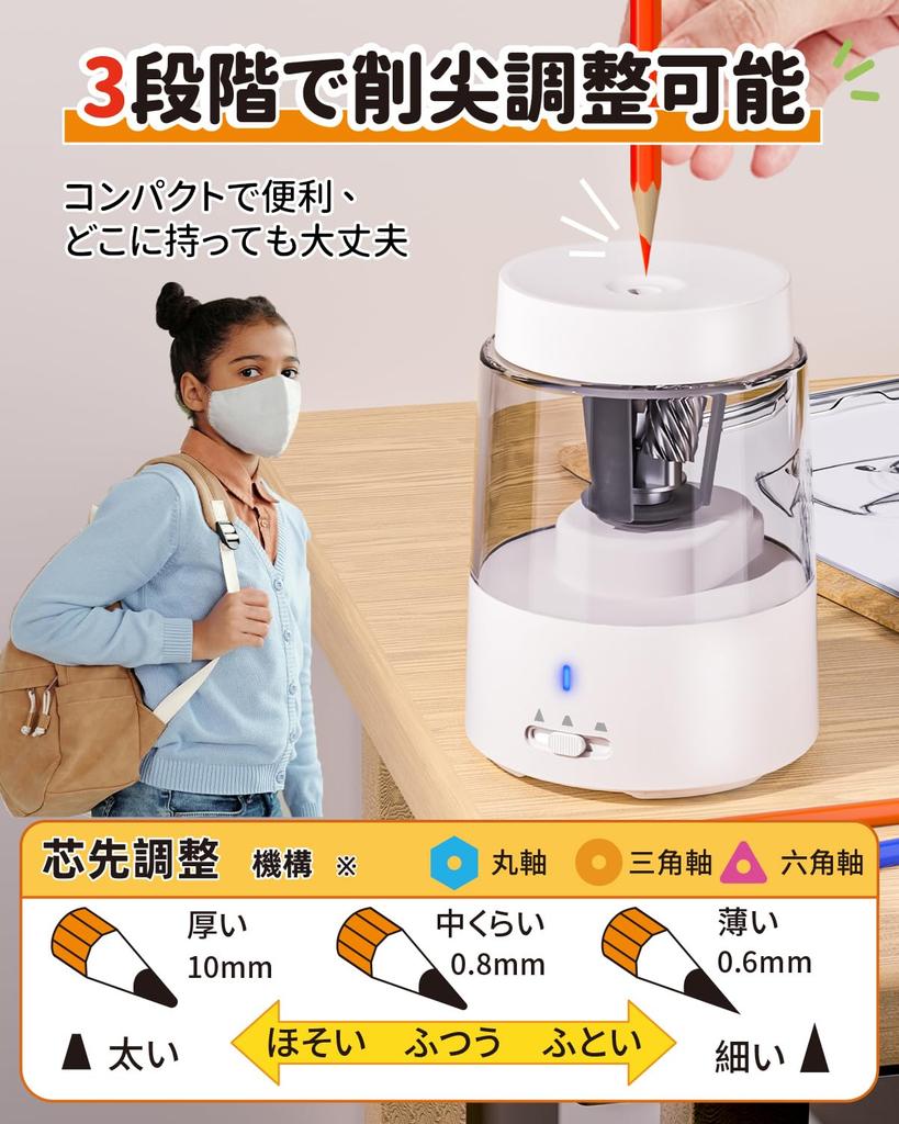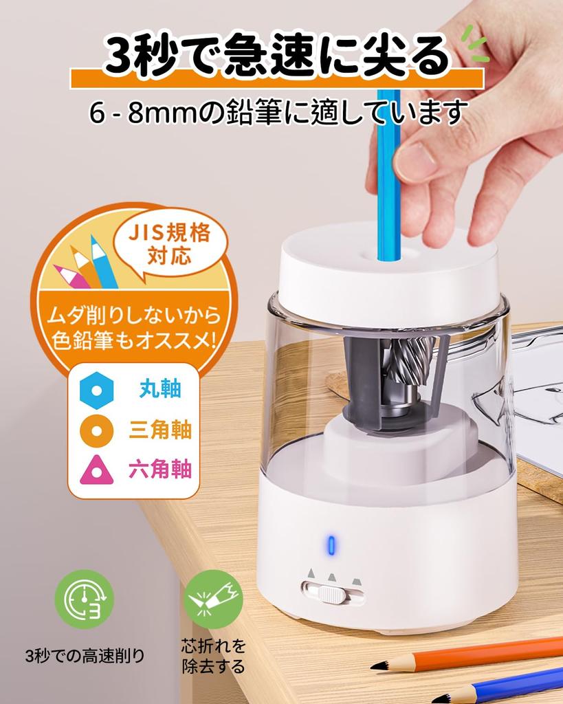 【Автоматическая остановка и быстрая заточка】Система откидных лезвий электрической точилки для карандашей автоматически прекратит резку, когда карандаш станет острым, защитит грифель карандаша и утилизирует сломанный грифель карандаша с умом.. Электрическая точилка для карандашей быстро и качественно затачивает карандаши примерно за 3–5 секунд.. Тихая и быстрая заточка. Пожалуйста, соблюдайте правила безопасности, когда дети пользуются точилками для карандашей.