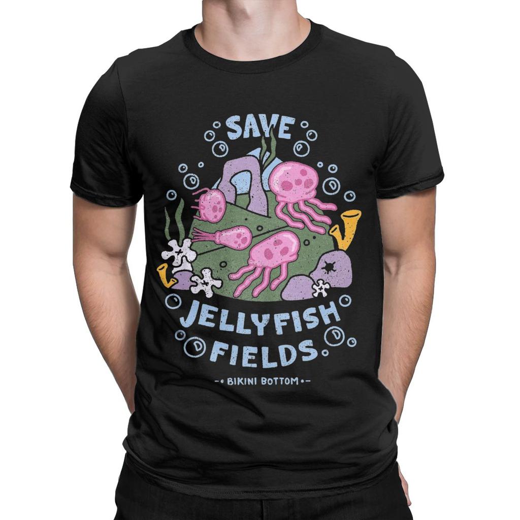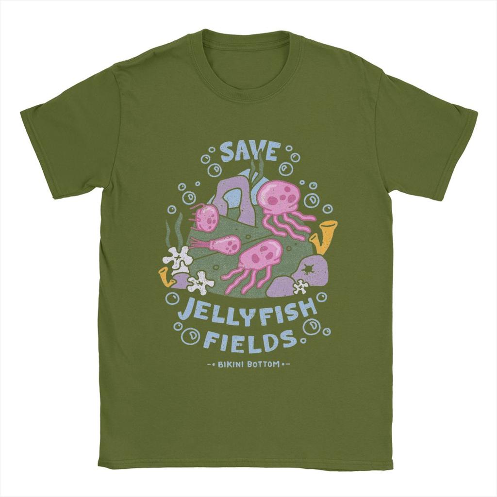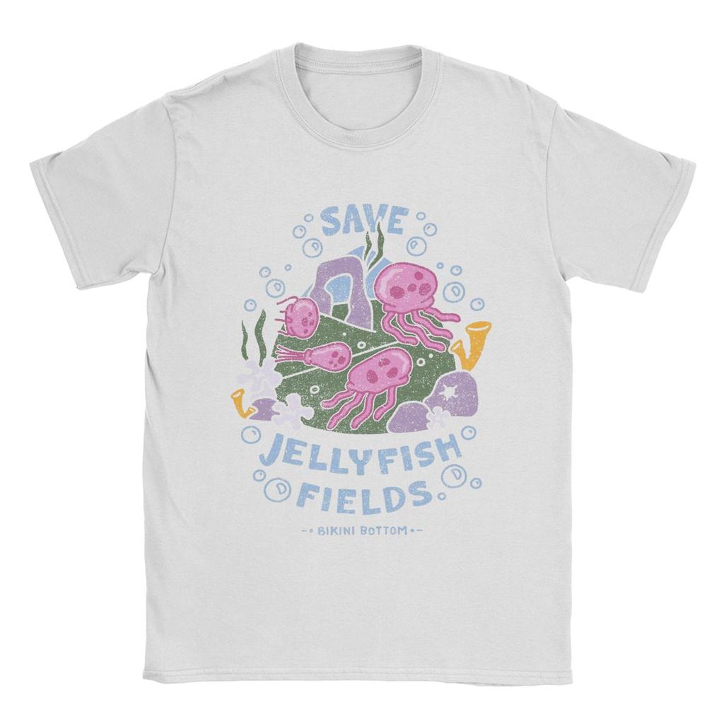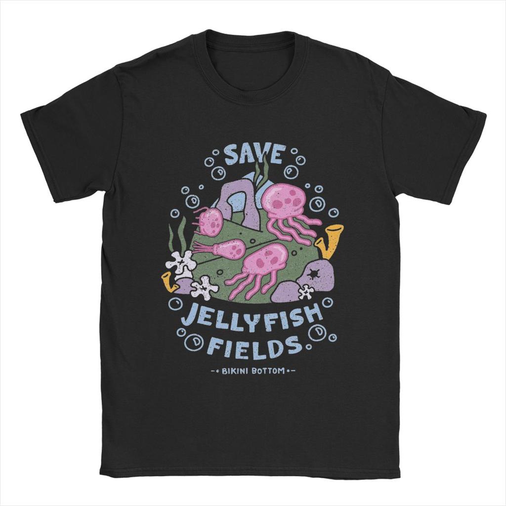 SpongeBobed Save Jellyfish Fields Bikini Bottom T-Shirts for Men Pure Cotton Tee Short Sleeve T Shirts Summer Clothing