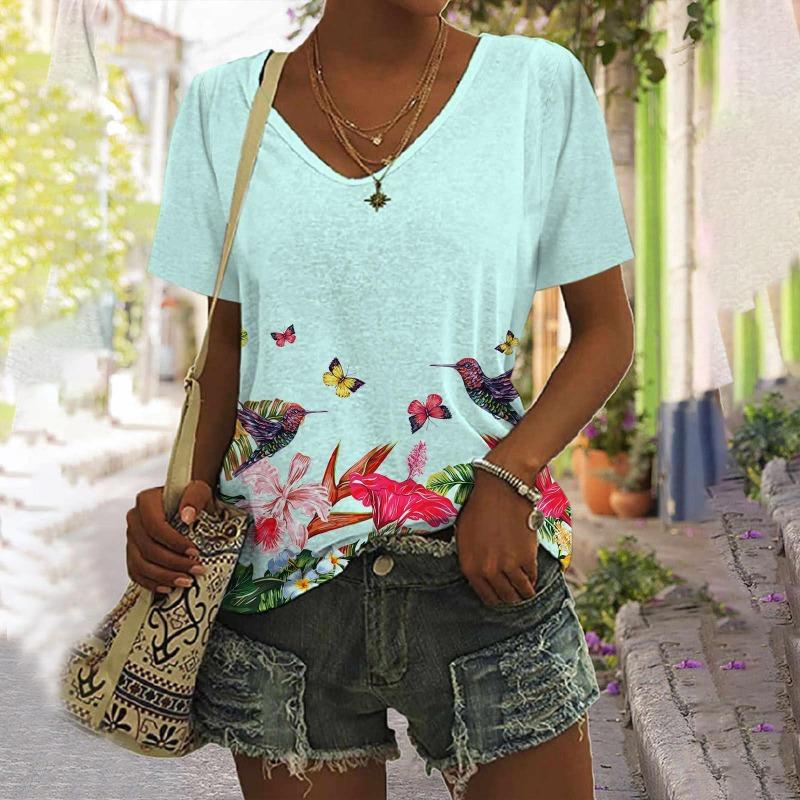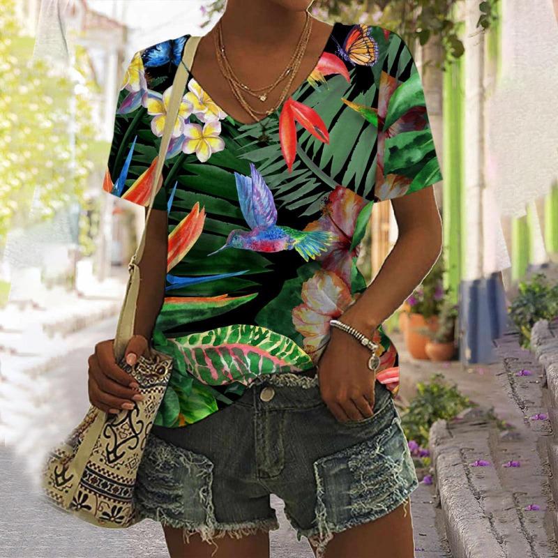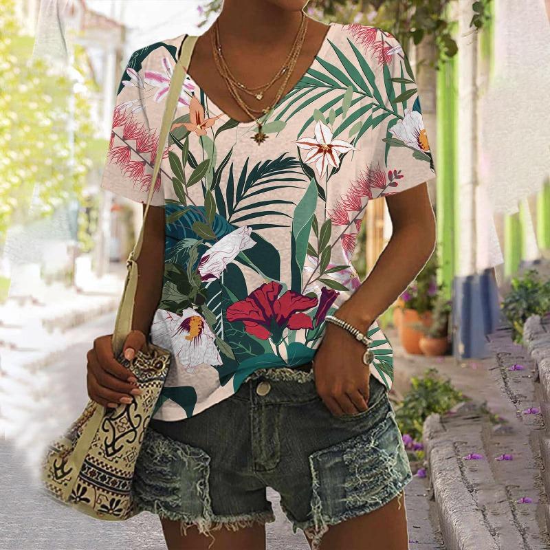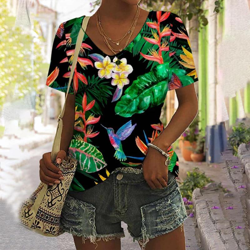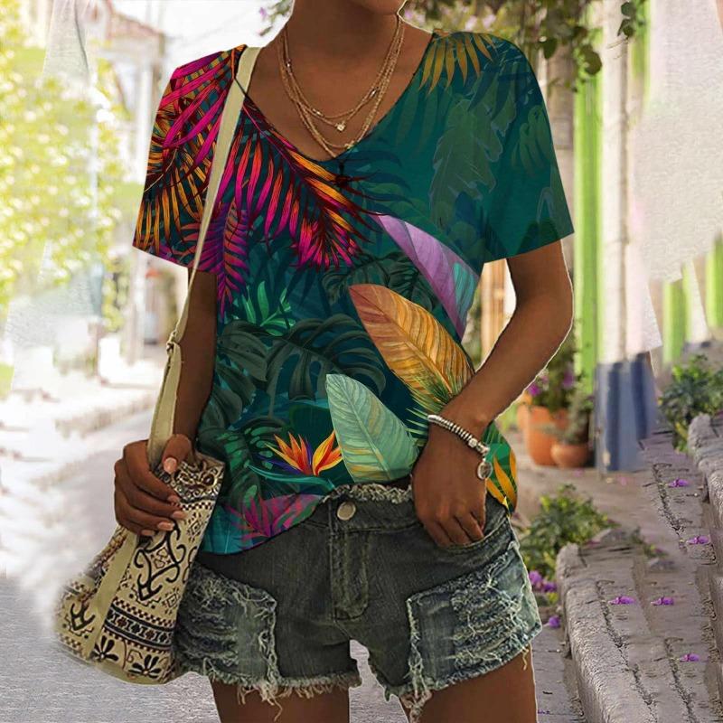 Футболки с цветочным принтом и тропическими растениями, женская футболка с 3D-принтом и V-образным вырезом, короткий рукав, свободные футболки Harajuku Y2k, женская одежда