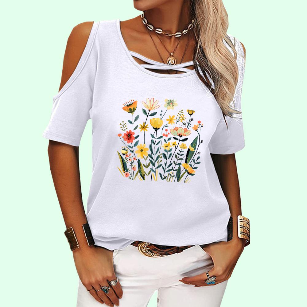 Женская модная футболка с круглым воротником и цветочным принтом, летний пуловер с открытыми плечами, повседневная футболка с коротким рукавом