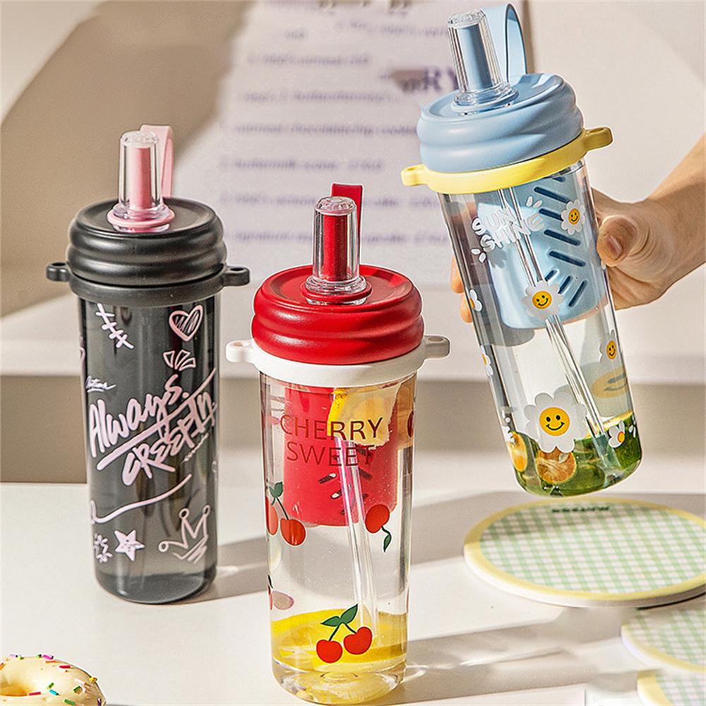 Летний спортивный пластиковый стакан для воды для прогулок, портативный студенческий стакан с соломинкой, мультяшный принт, маленький свежий стакан для воды для дома, 900 мл
