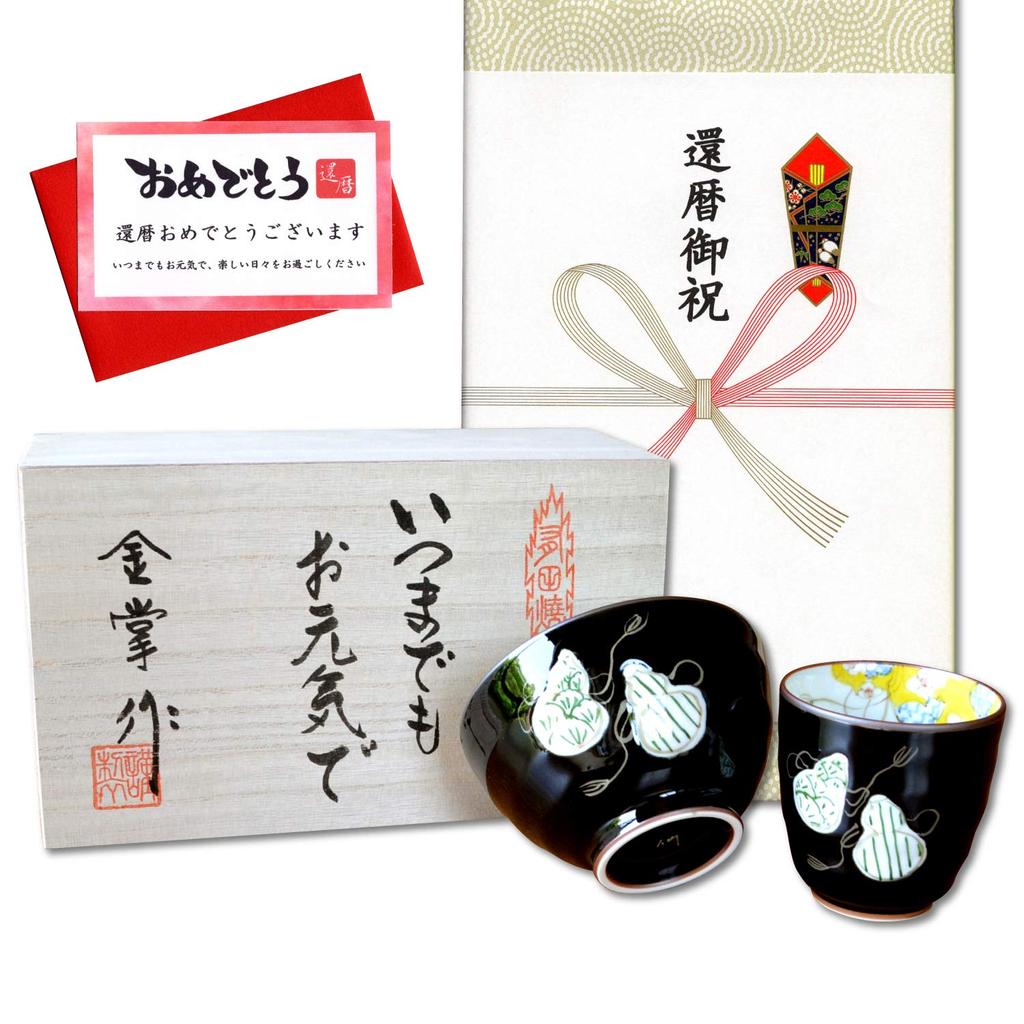 Подарок на 60-летие на удачу для хорошего чая Arita Ware, миска для риса из шести тыкв Noshi и открытки с посланием, деревянная коробка, праздник, здоровье, чашка, миска, набор,