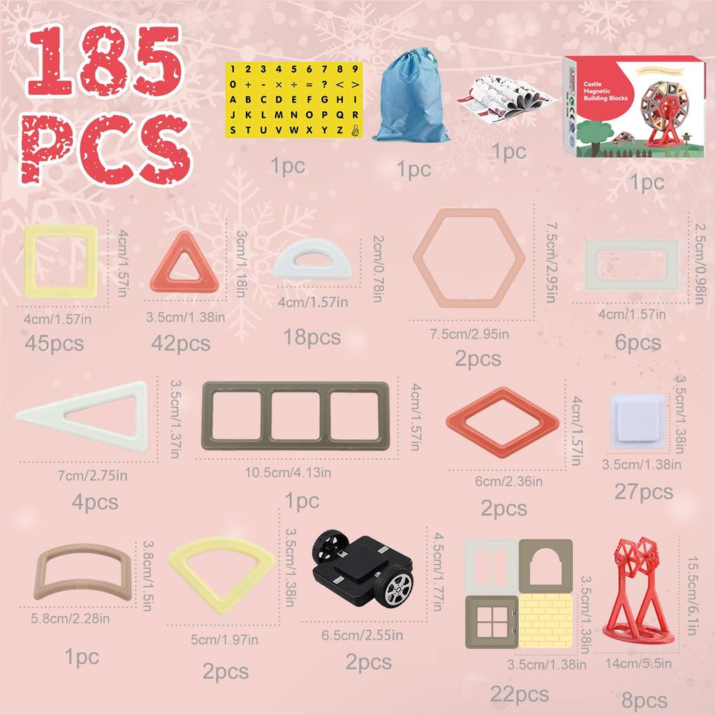 [Введение в продукт] В этой игрушке 185 блоков.. Равносторонний треугольник*42 шт., квадрат*45 шт., равнобедренный треугольник*4 шт., белая пластина*27 шт., прямоугольник*6 шт., полукруг*18 шт., шестиугольник*2 шт., сектор*2 шт., ромб*2 шт., треугольник*1 шт. Содержит такие детали, как 1 шт. форма арки, 1 шт. наклейка с алфавитом, 1 шт. понятное руководство, 2 шт. колеса, 8 шт. деталей колеса обозрения, 1 шт. сумка для хранения и 22 шт. оставшихся блоков.. Это привлекательный продукт с красивыми цветами и хорошим размером.. Это привлекает внимание детей и позволяет им участвовать в играх, развивающих ловкость пальцев, например, в сборочных играх.