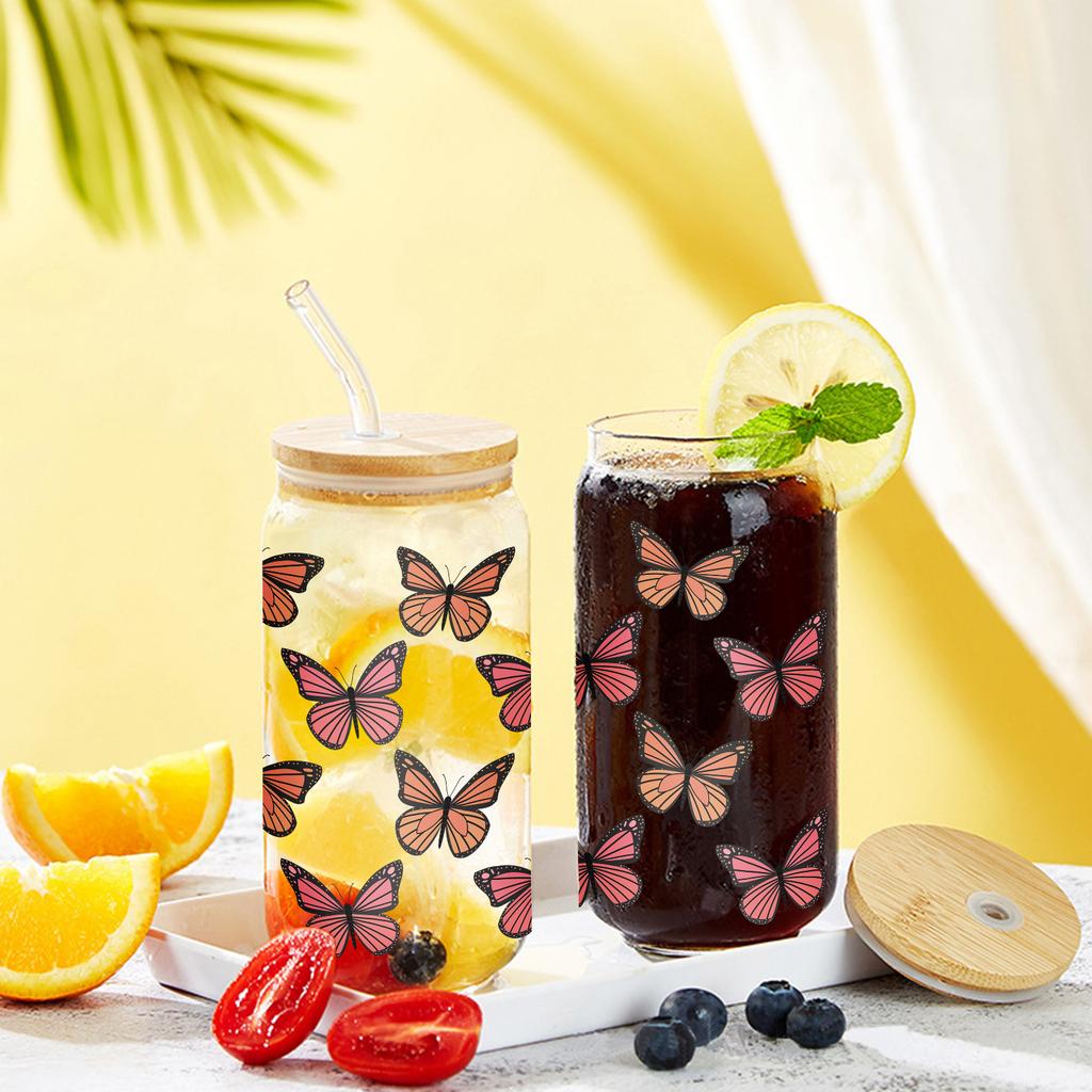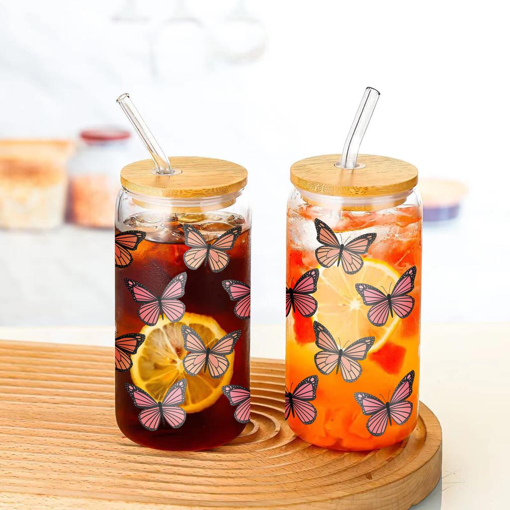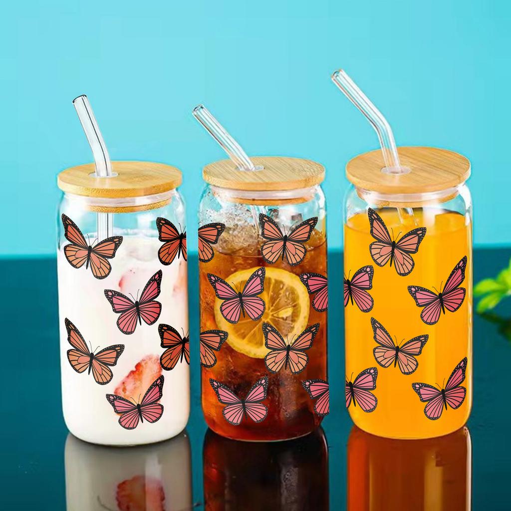 Кружка стеклянная 16 унций с 3D-принтом «Бабочки», банка Мейсона, бутылки для воды с бамбуковой крышкой и соломинкой, стакан для питья, стакан для газировки, стакан для кофе со льдом