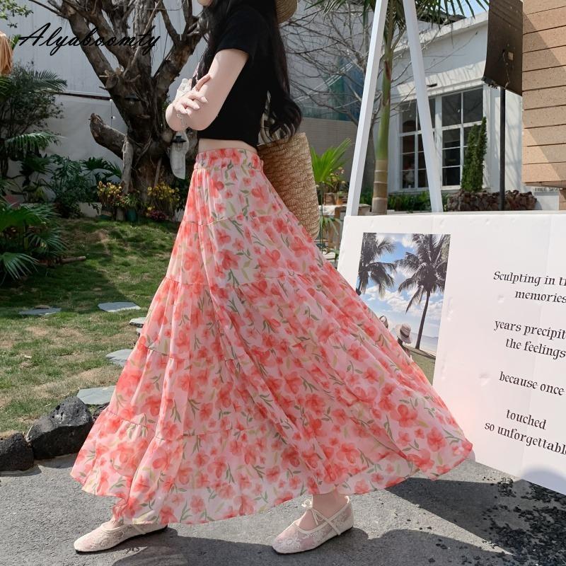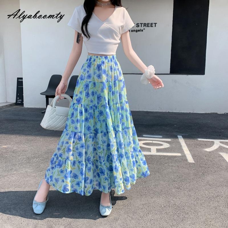 Корейский стиль весна-лето женская миди шифоновая юбка с высокой талией контрастного цвета сине-розовая цветочная юбка многослойные оборки милые юбки женские