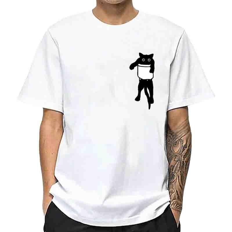 Мужская высококачественная футболка 100% хлопок, забавный принт с изображением кота на кармане, летняя свободная крутая футболка с круглым вырезом для мужчин, короткие рукава, мужские футболки
