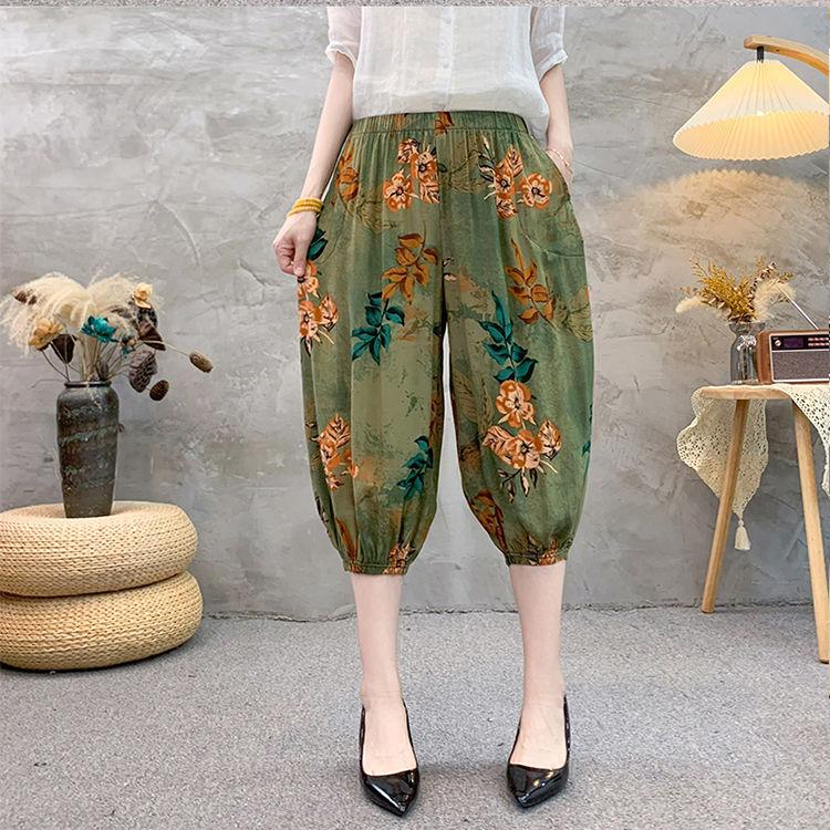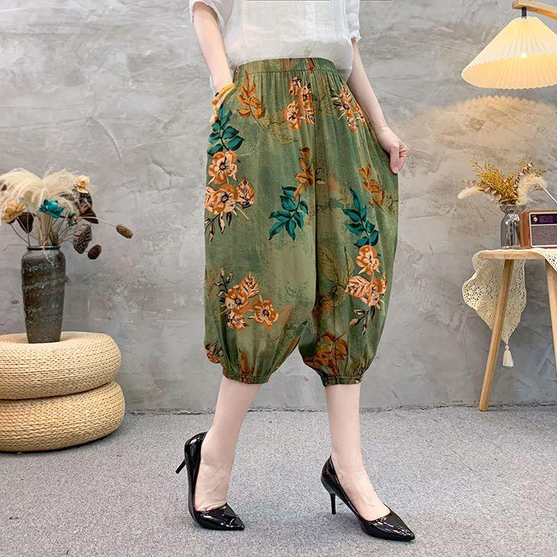 Летние ретро свободные эластичные шаровары с высокой талией этнический принт брюки-фонарики для женщин