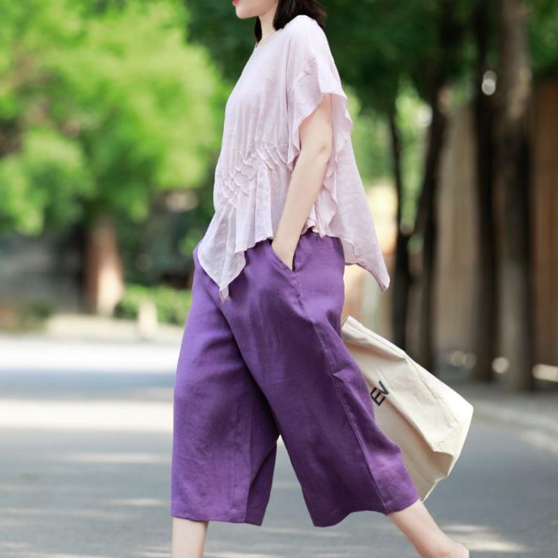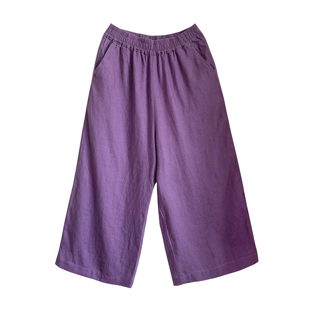 Широкие брюки из хлопка и льна для женщин летом Тонкие укороченные брюки Укороченные брюки из льна в стиле ретро Свободные прямые фиолетовые брюки