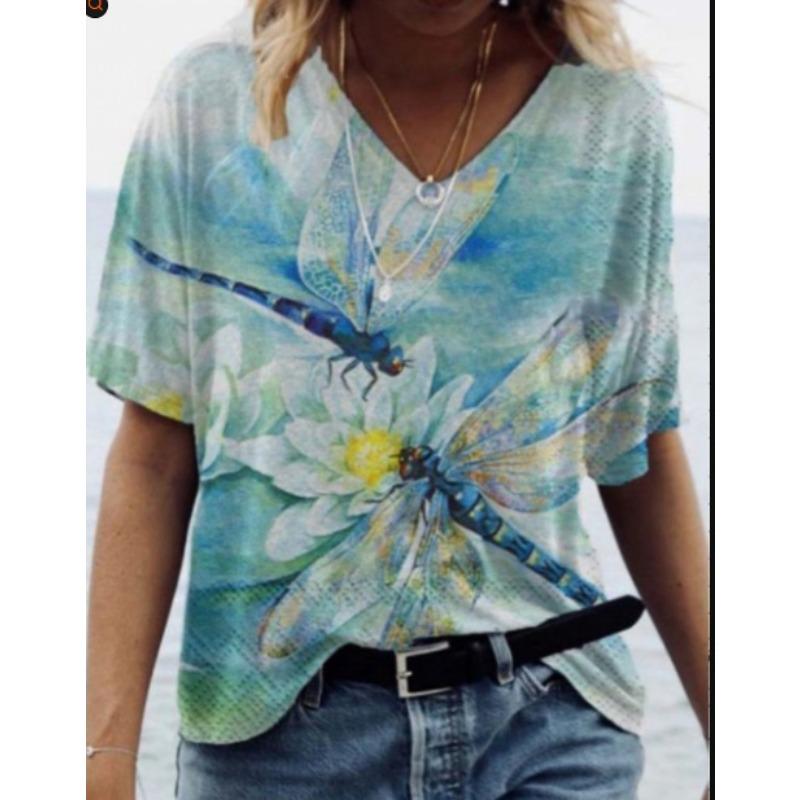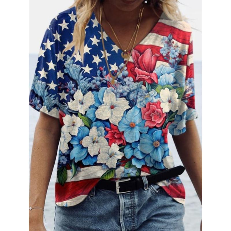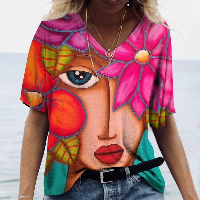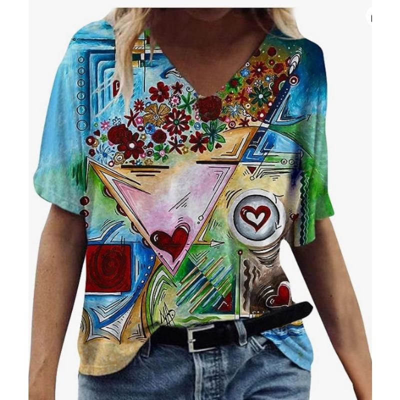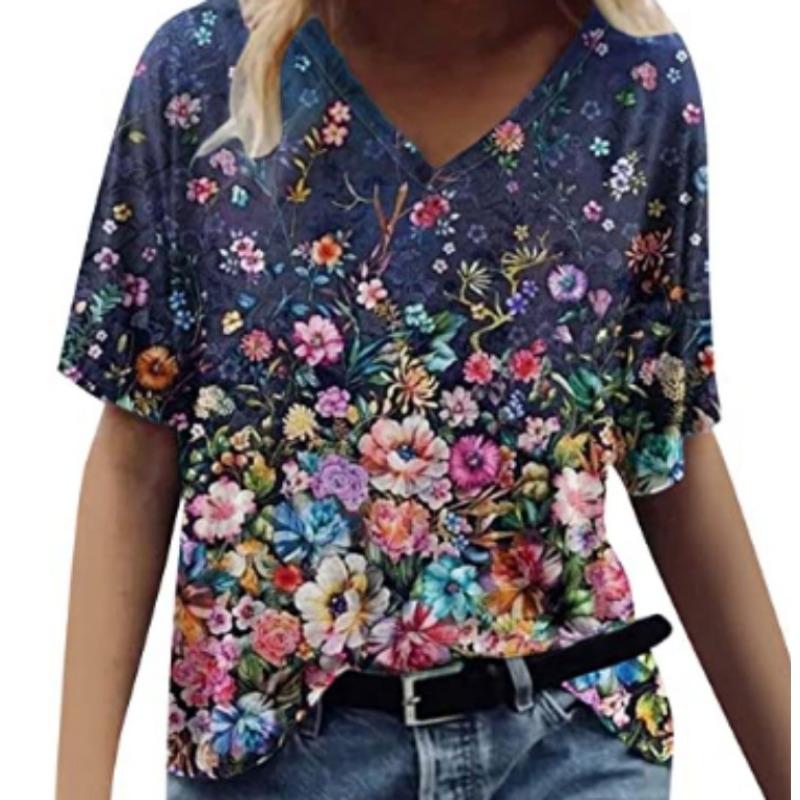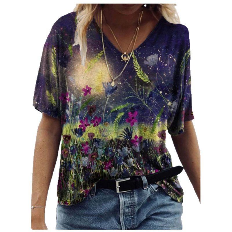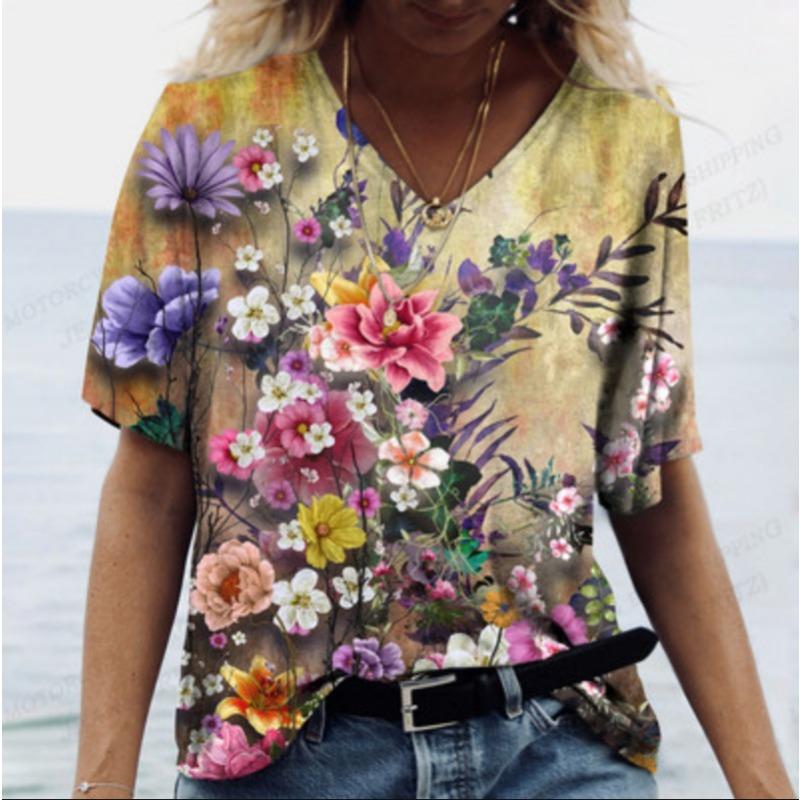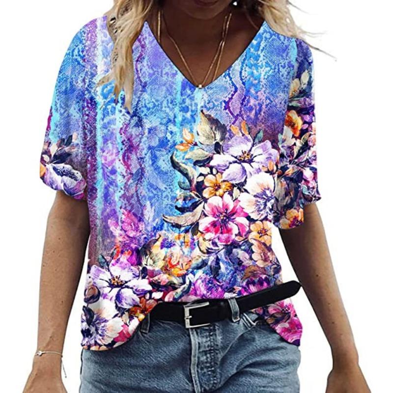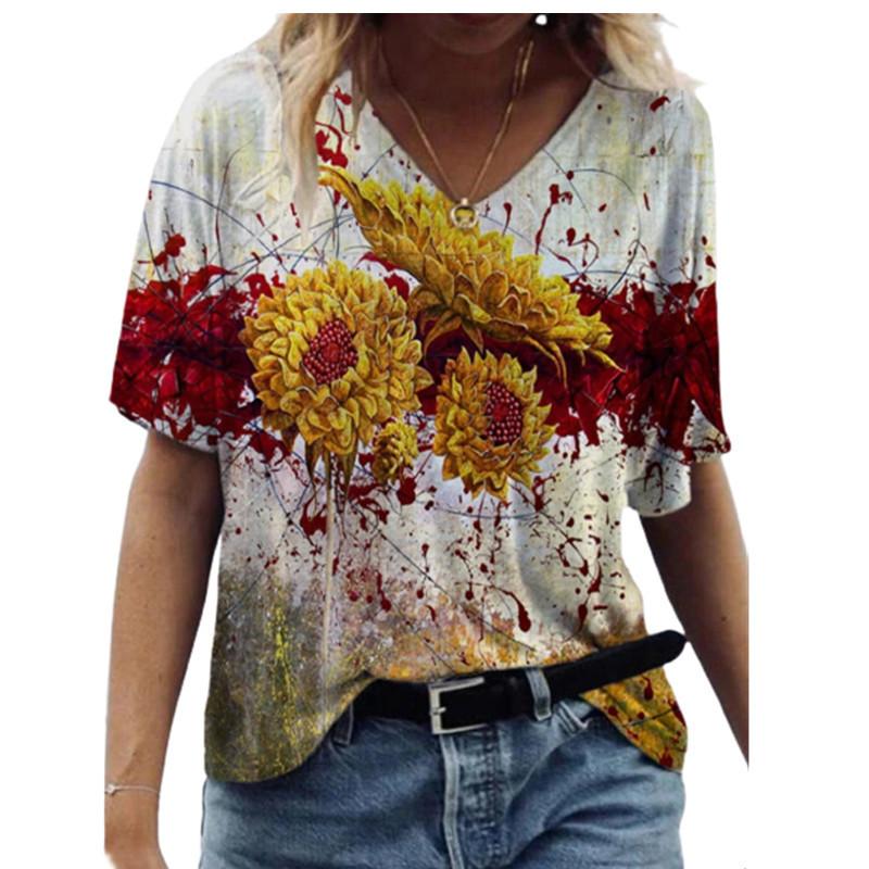 Летний топ с V-образным вырезом и 3D-цветочным принтом, модные повседневные женские футболки с короткими рукавами