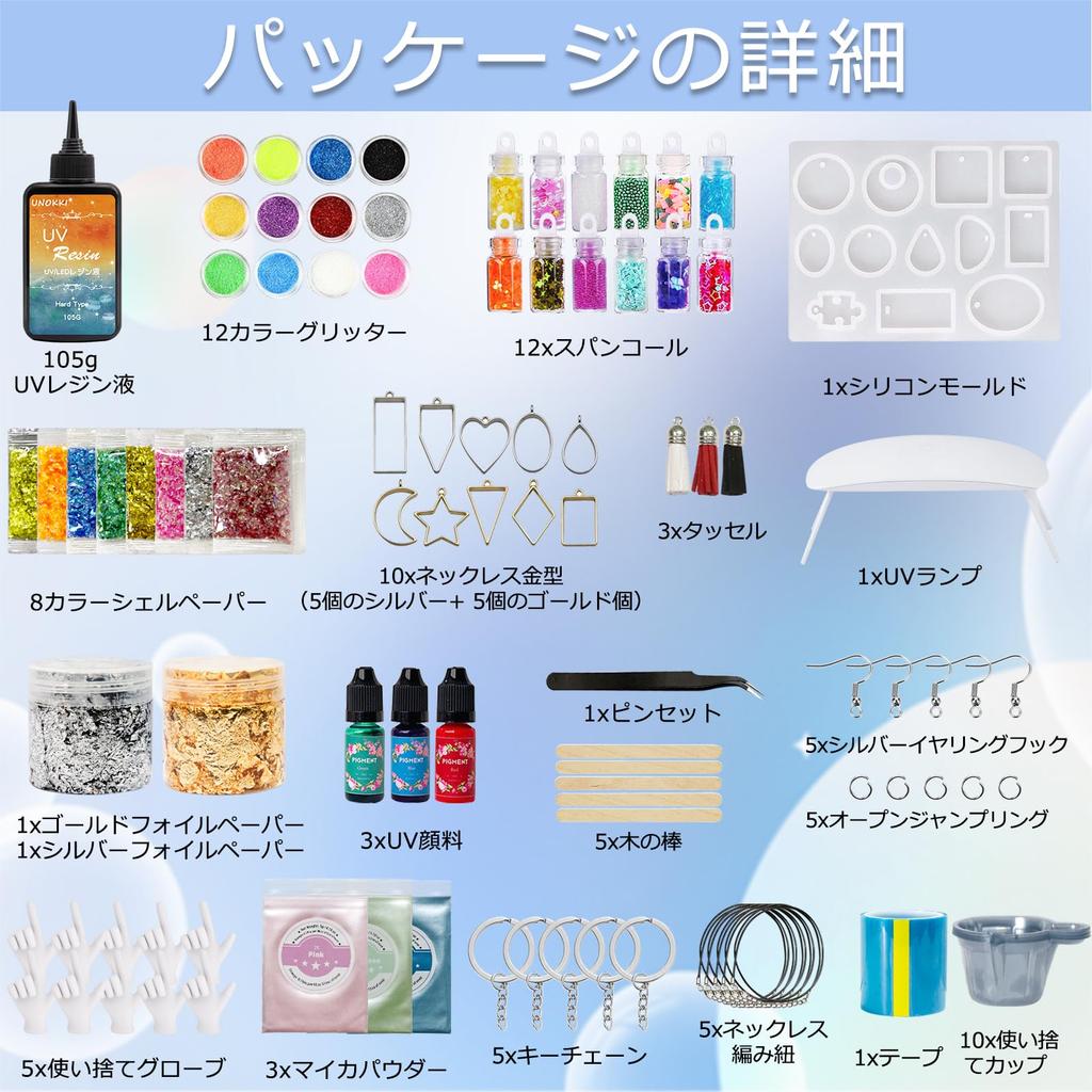 [Содержимое набора смолы] УФ-смола + УФ-лампа + кабель типа C, 1 силиконовая форма, 1 лист золота, 1 серебряная фольга, 12 пайеток, 12 цветов блесток, 3 цвета слюдяного порошка, 3 пигмента УФ-смолы, 8 упаковок оболочной бумаги, 10 форм (5 золотых + 5 серебряных), 1 пинцет, 5 палочек для перемешивания, 5 цепочек для ключей, 5 крючков для сережек, 5 разъемных колец, 1 лента, 5 пар перчаток, 10 одноразовых стаканчиков, 5 цепочек для ожерелий, 3 кисточки.