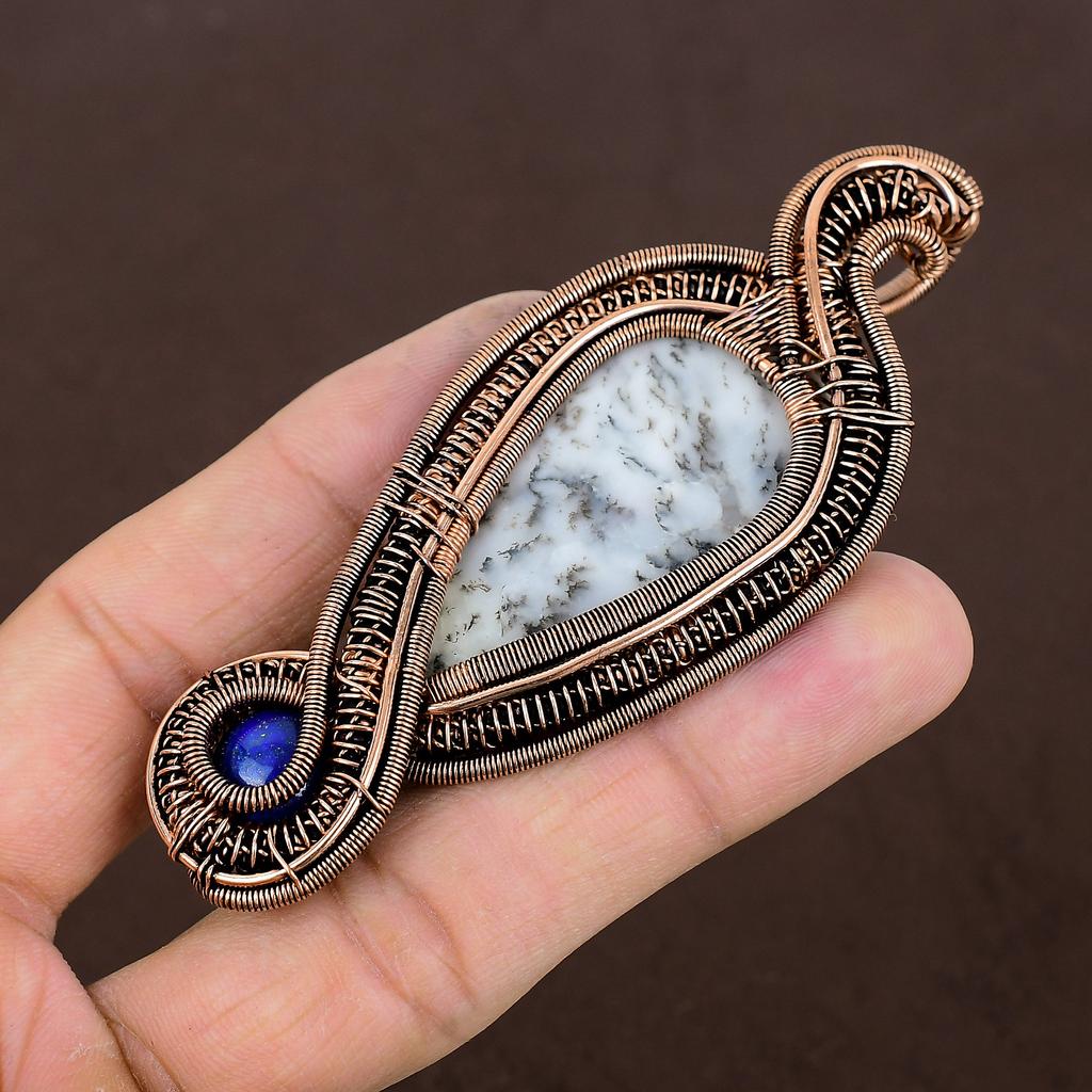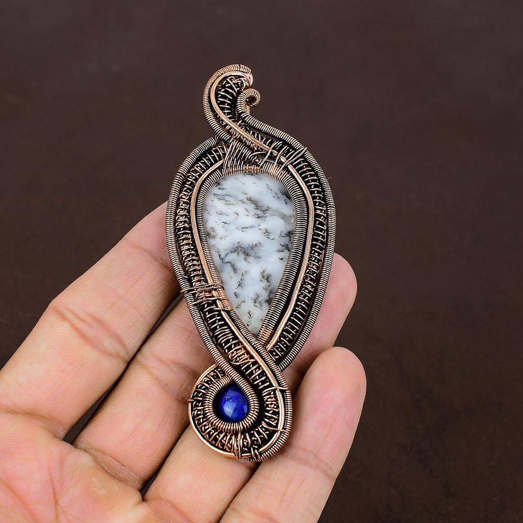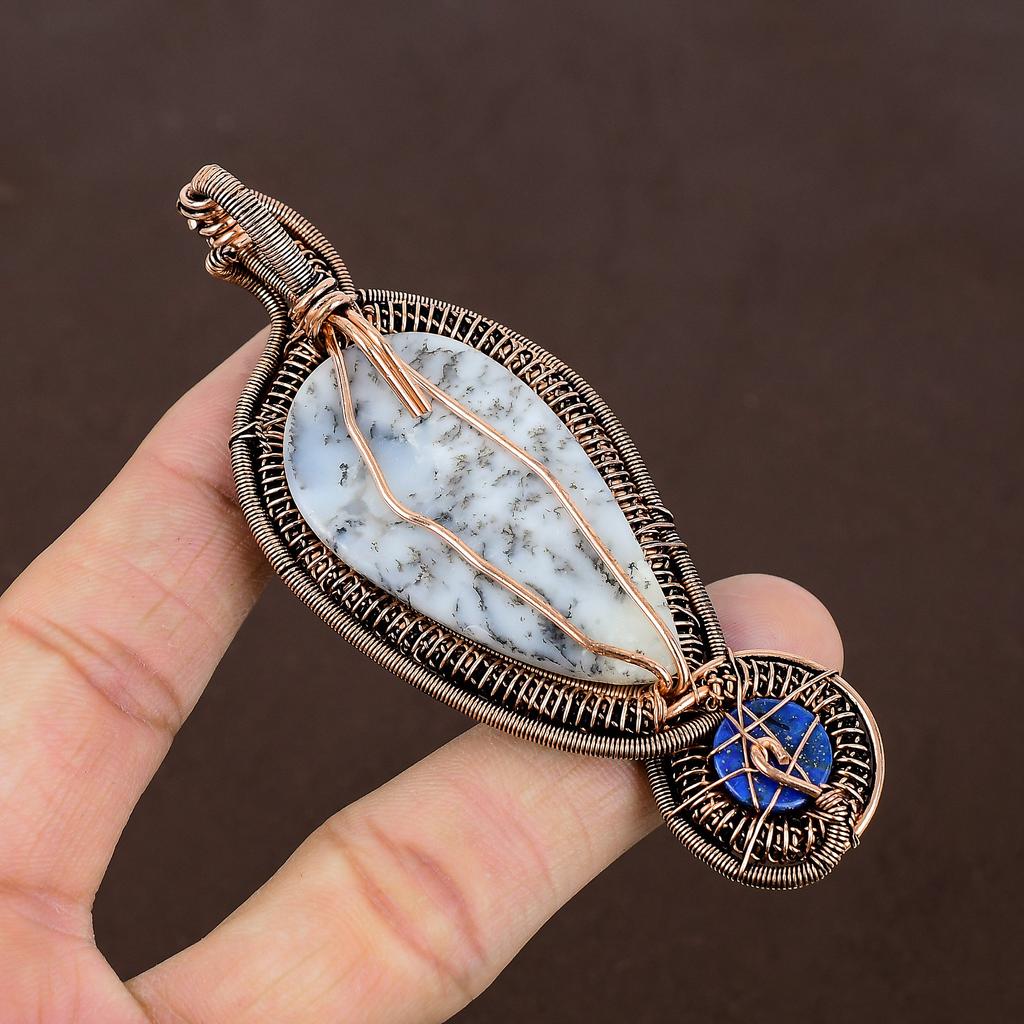 Дендритовый Опал, Лазурит Кулон в Оплетке из Меди Ручной Работы 3.54" W1r84