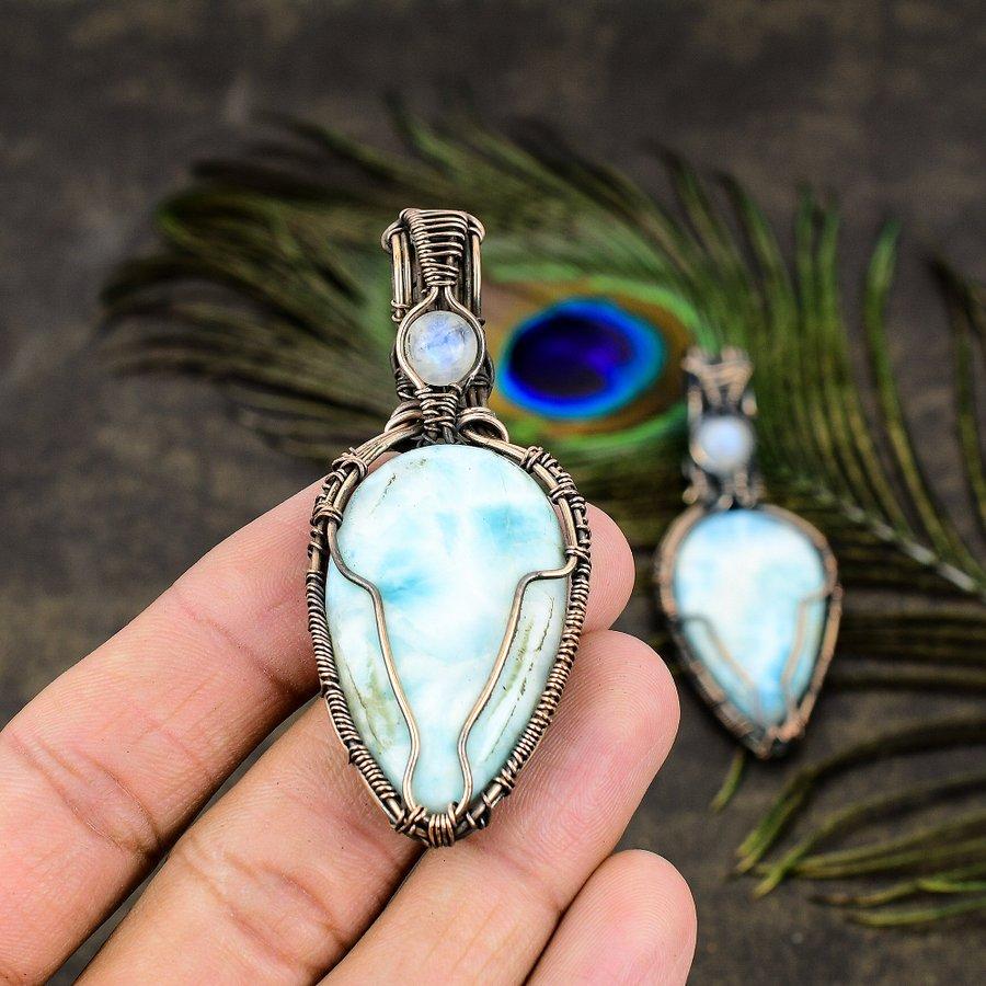 Caribbean Larimar Handmade Copper Wire Wrap Jewelry Pendant 2.76" g3P37