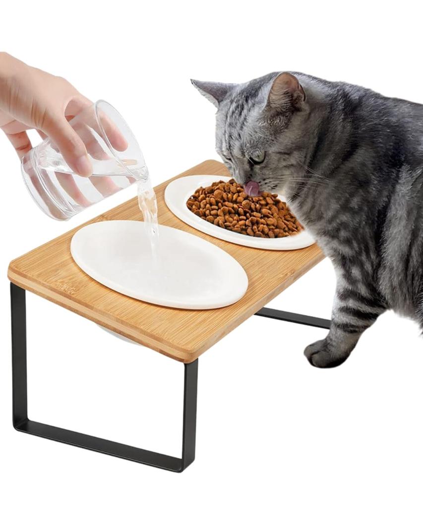 [Высококачественные материалы] Стол для посуды изготовлен из прочного натурального бамбукового материала, который обладает эффектом подавления роста бактерий.. Миска изготовлена из высококачественного керамического материала, который более устойчив к мелким царапинам, чем пластик, и предотвращает появление угрей у кошек.