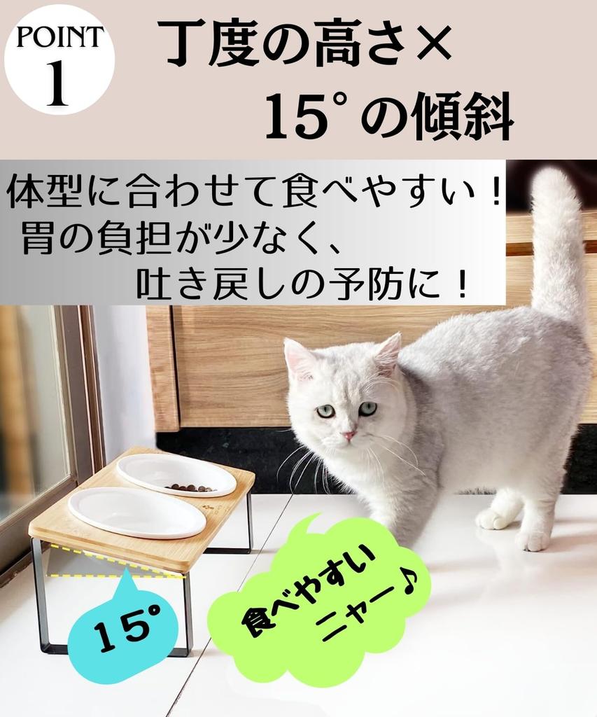 [Диагональная конструкция для удобного положения] Основанная на естественной позе кошки, конструкция имеет наклон в 15°, чтобы предотвратить сдавливание спинного мозга.. Корм разработан таким образом, чтобы не допустить просыпания корма маленькими собаками и кошками, и его легко есть, позволяя им наслаждаться каждым кусочком.. Поскольку он находится примерно на одной высоте от пола, еда и вода не будут загрязнены пылью или насекомыми.. Также можно ожидать, что размещение тарелок в местах, где их можно легко увидеть, предотвратит слишком быстрый прием пищи.