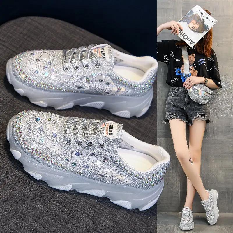 Женские кроссовки на платформе 2024 года, осенние повседневные спортивные кроссовки со стразами и пайетками на шнуровке, женские дышащие кроссовки Zapatos Mujer