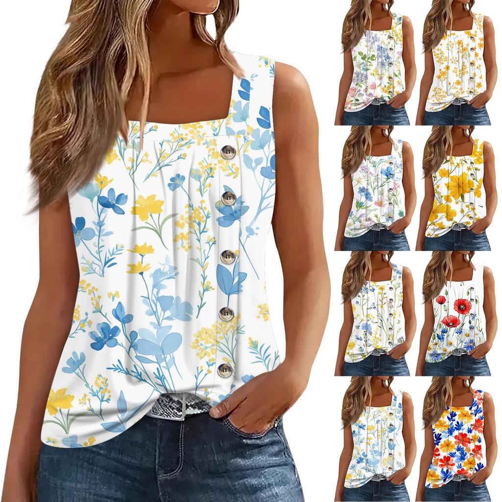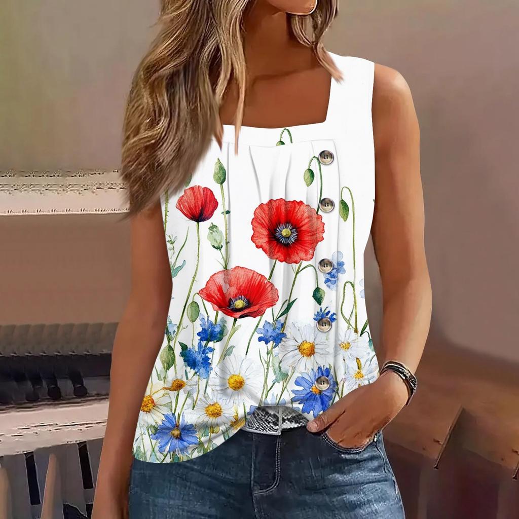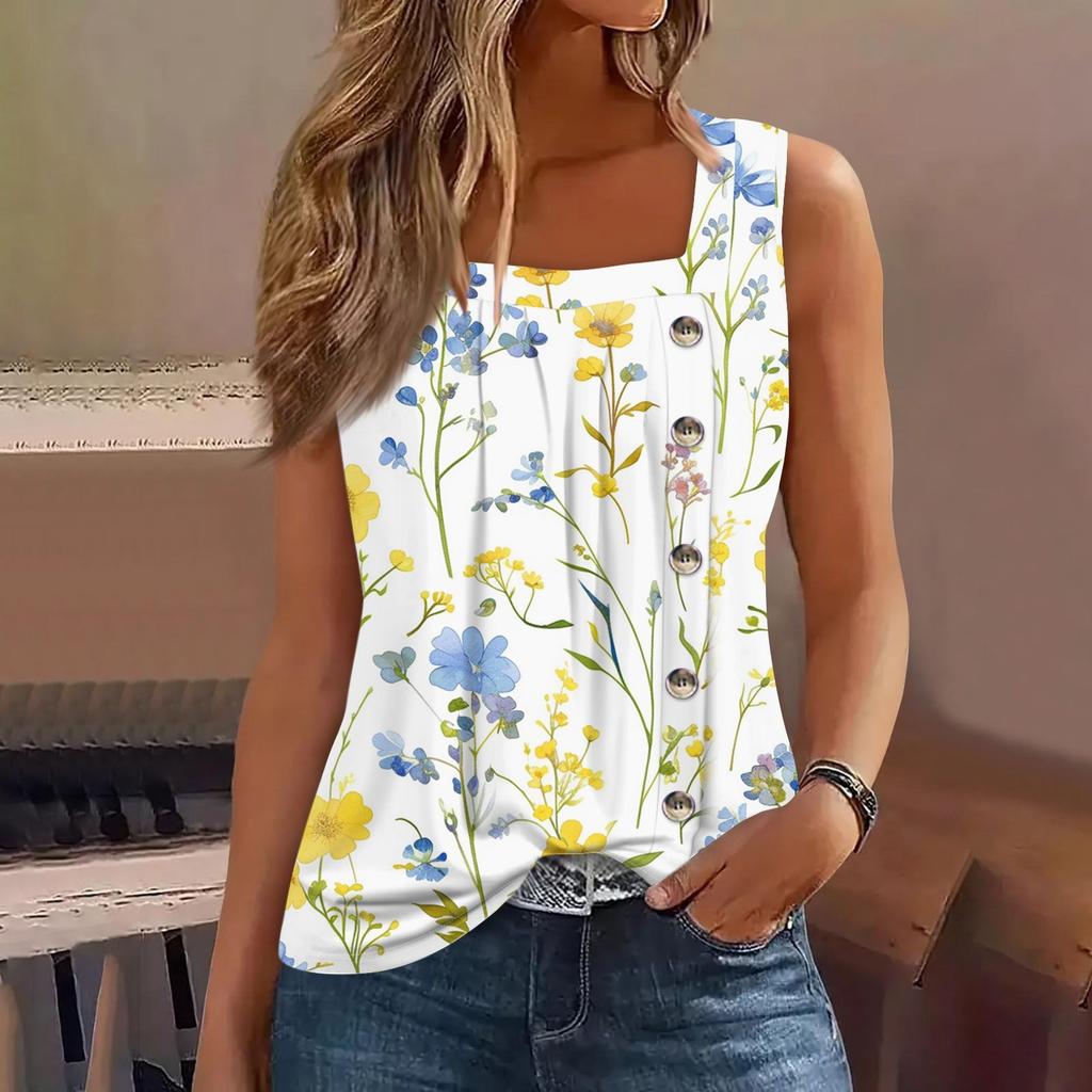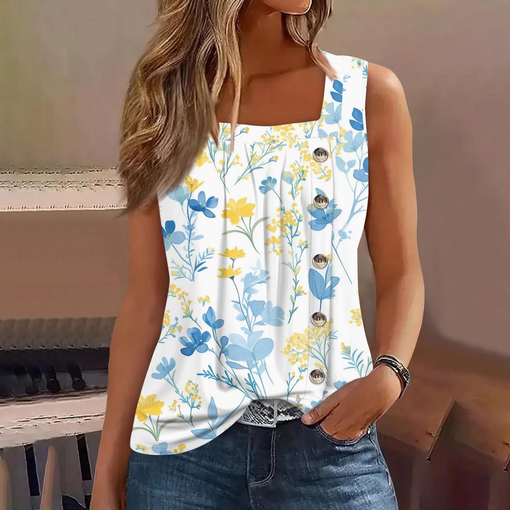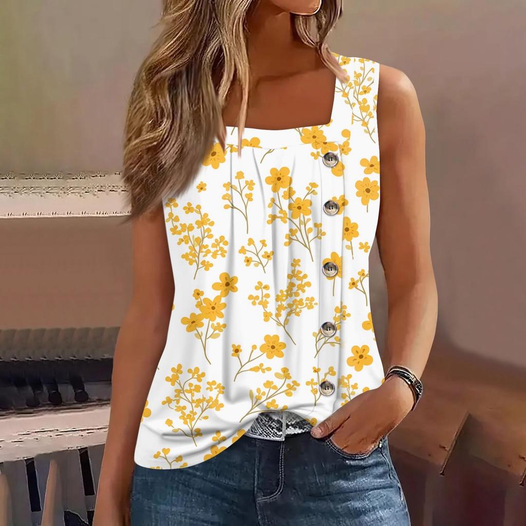 Женская мода, повседневный базовый плиссированный жилет без рукавов с квадратными пуговицами и принтом, летние майки