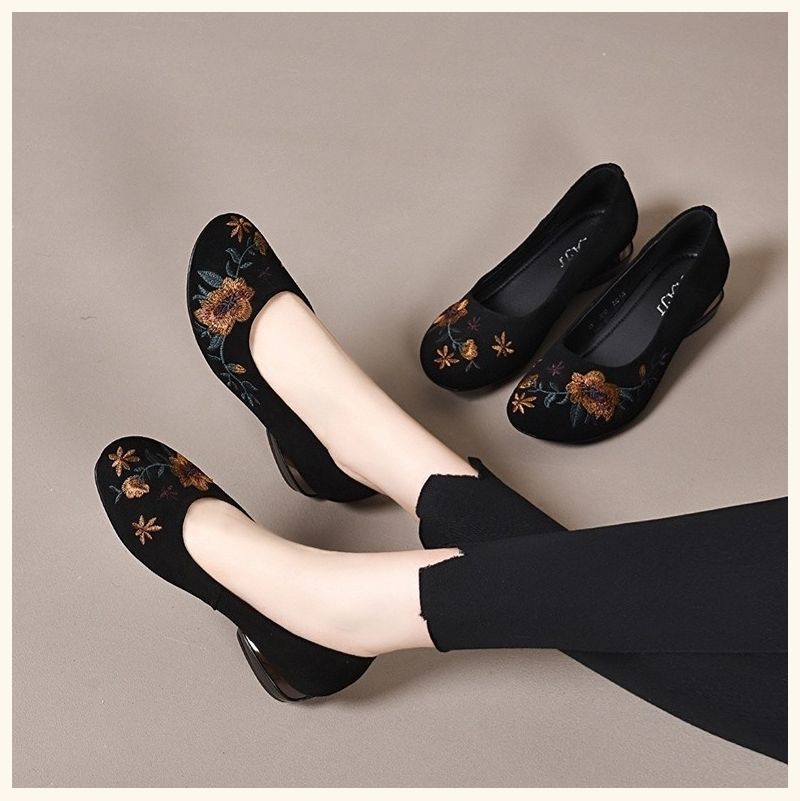 Туфли на грубом каблуке, женские туфли с неглубоким носком, туфли для мам с круглым носком, вышитые туфли, удобные туфли из матовой кожи, мягкая кожа
