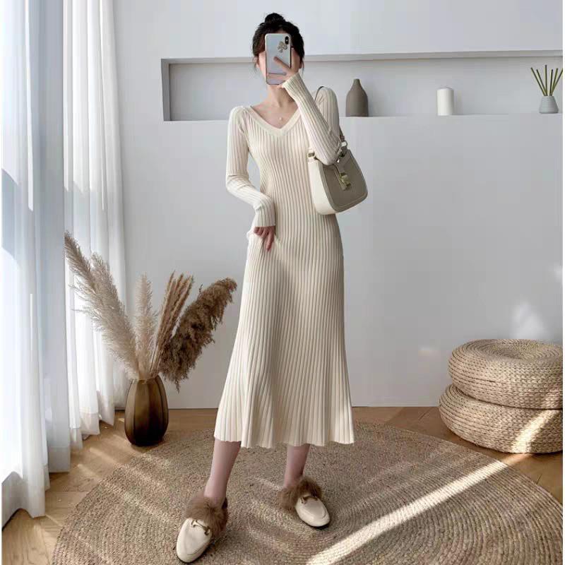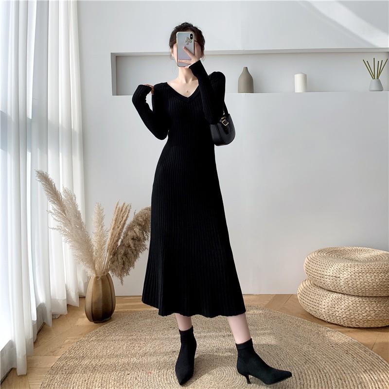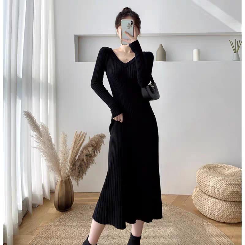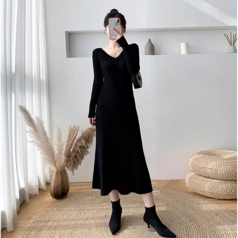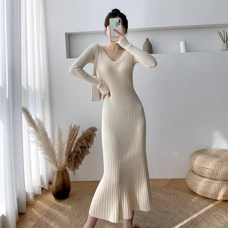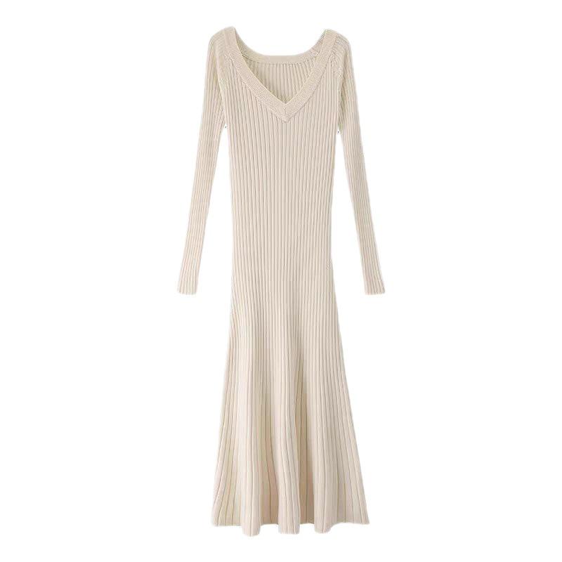 Универсальное трикотажное облегающее платье длиной до колена с V-образным вырезом для женщин - коллекция Осень и Зима.