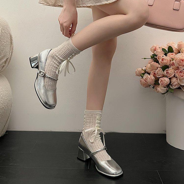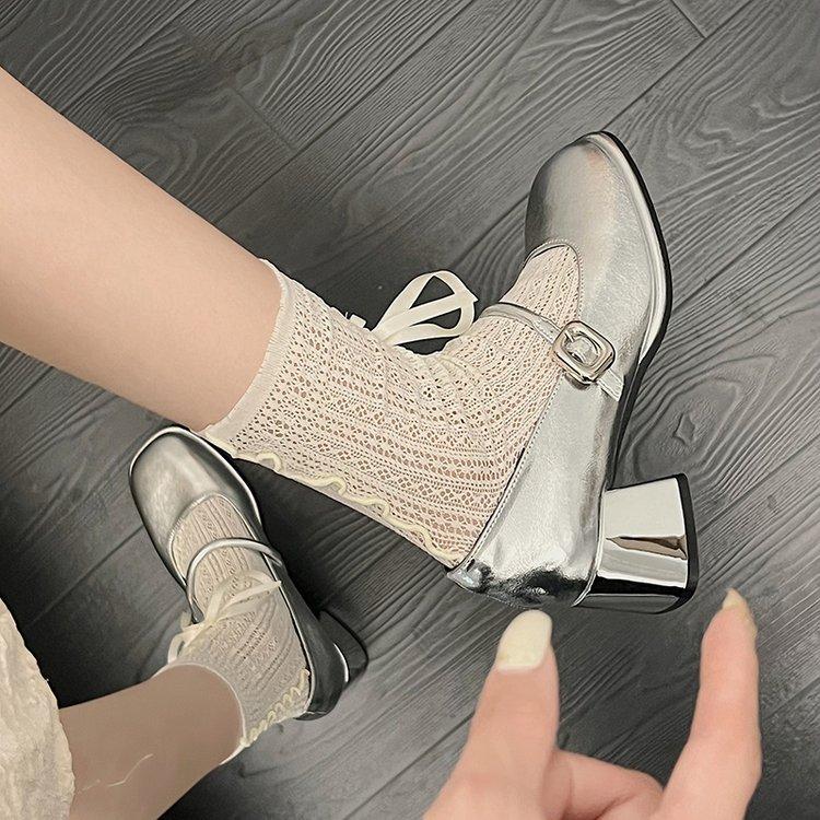 Женские туфли на высоком каблуке 2025 лето новые толстый каблук ночной бриз нежные французские туфли Мэри Джейн с юбкой серебристые одинарные туфли