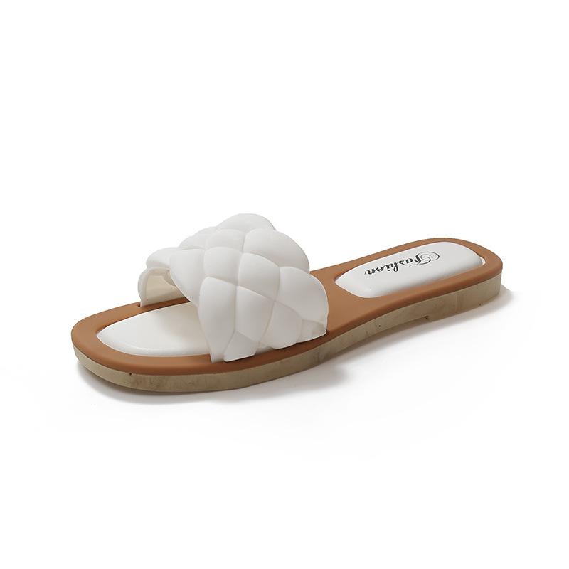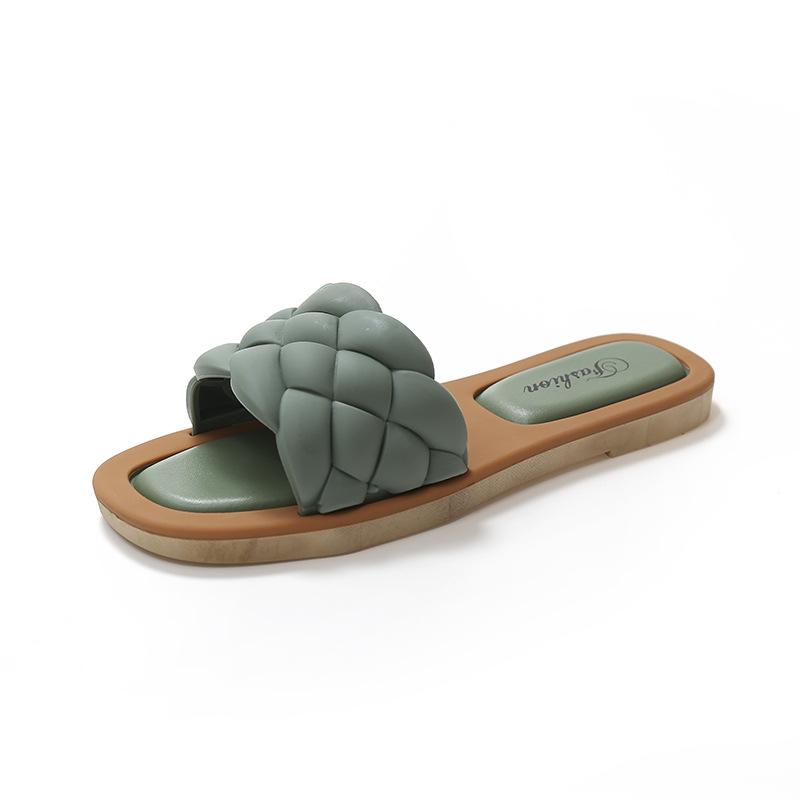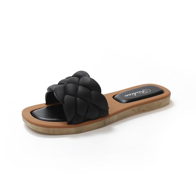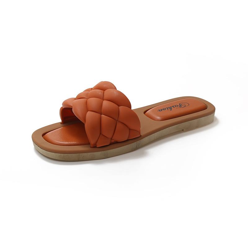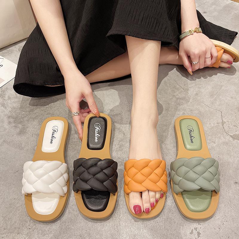 Женские тапочки на плоской подошве 2025 года, новые летние сандалии из ПУ с плетеным верхом для студентов, повседневная одежда, пляжная обувь с одним персонажем