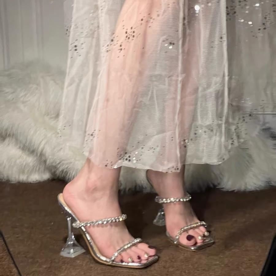Прозрачные босоножки на высоком каблуке со стразами, женские летние туфли на тонком каблуке со стразами, стильные тапочки и шикарные туфли-юбки в стиле феи.