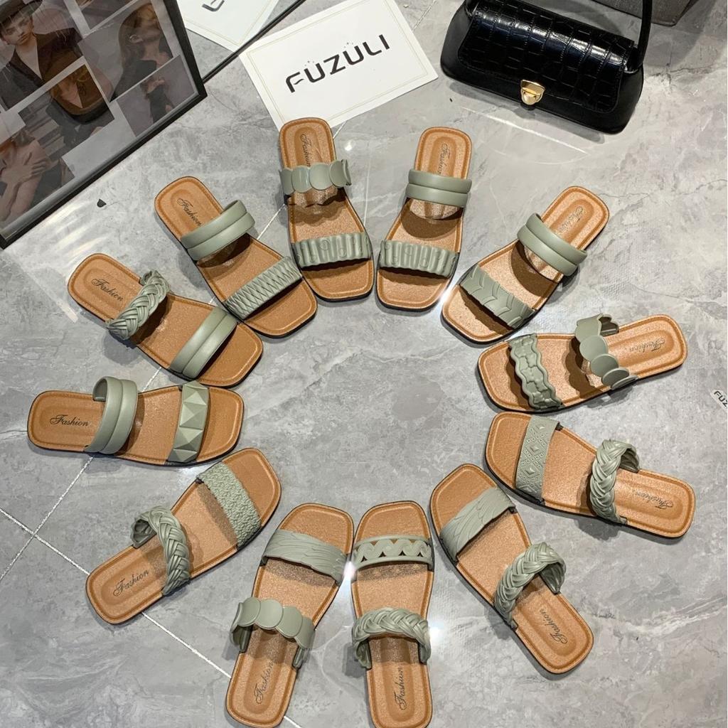Повседневные тапочки женская верхняя одежда лето новая мода квадратный носок плоские сандалии на открытом воздухе одно слово с пляжными тапочками