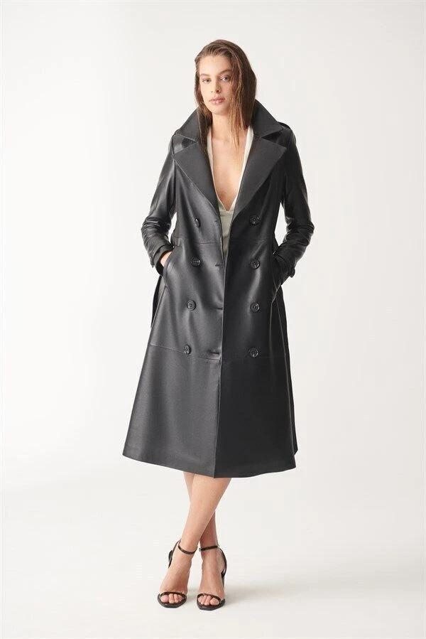 Женский плащ из овчины ручной работы Черный Кожа Натуральная Длинный Вечерний Стильный