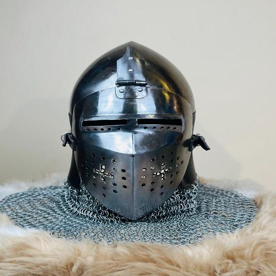 Наденьте доспехи средневекового рыцаря со шлемом нюрнбергский бацинет, тщательно выкованным вручную шедевром, вдохновленным европейской боевой экипировкой XIV века.