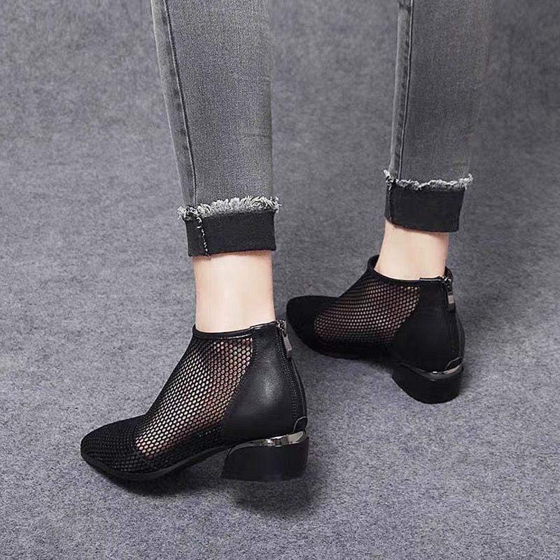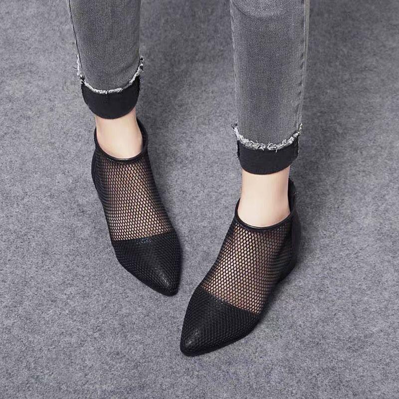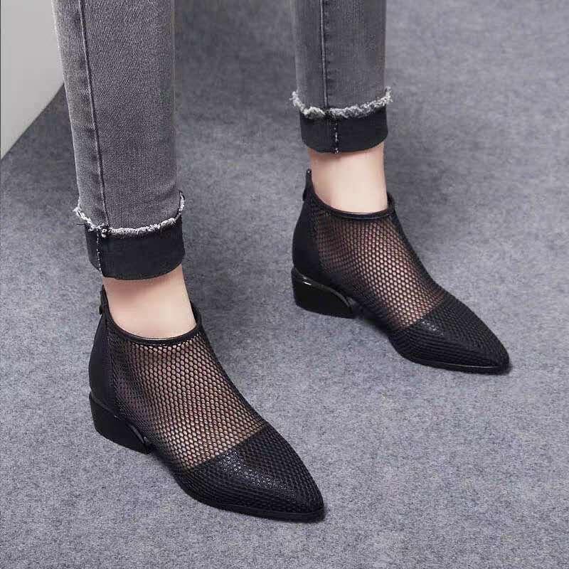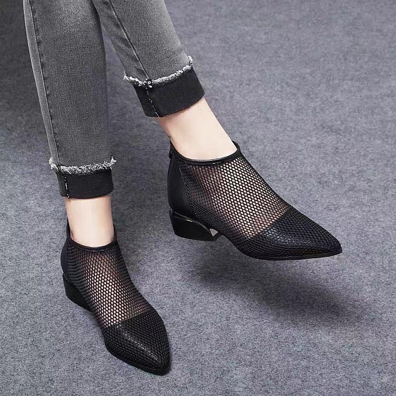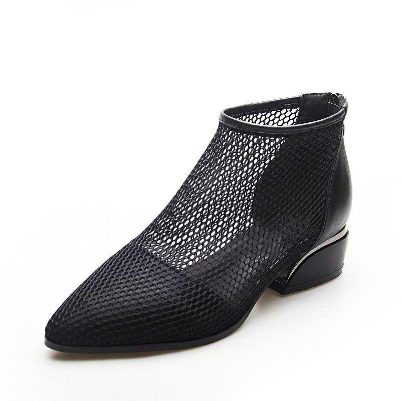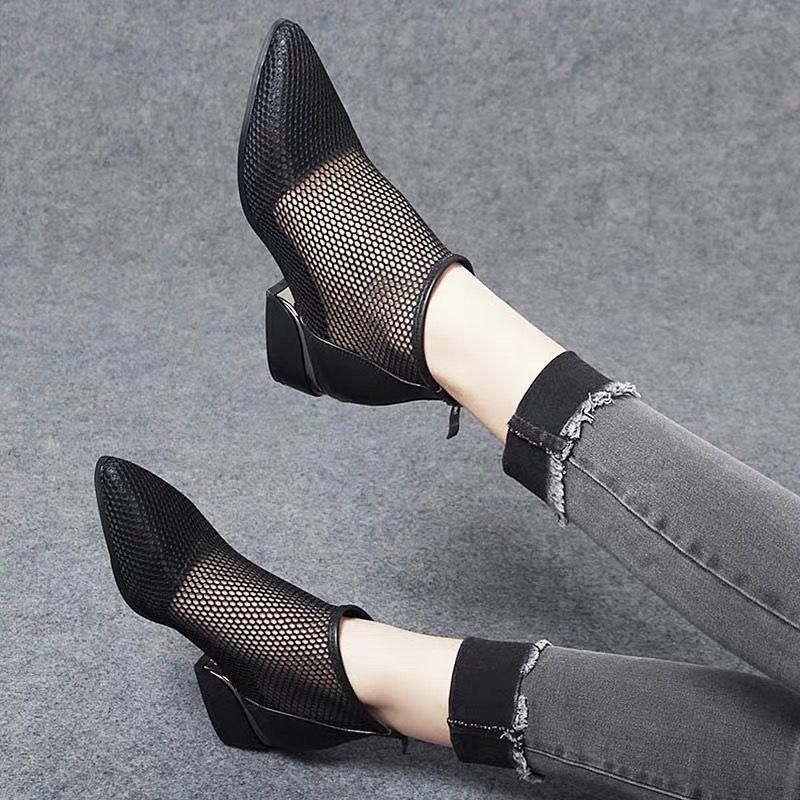 Новые ботинки в сетку на среднем каблуке и толстом каблуке. Женская обувь с отверстиями. Дышащие удобные сандалии с острым носком на сетке. Короткие ботинки.