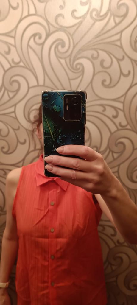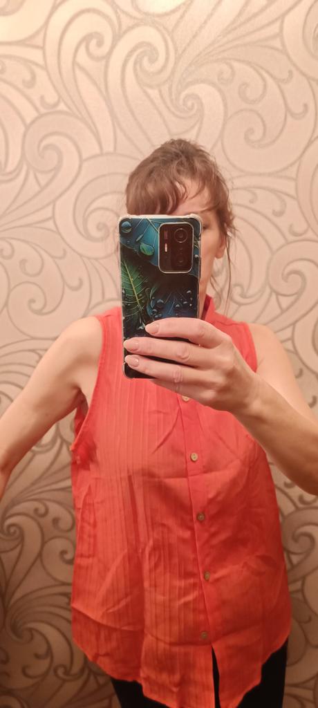 На свой 46 размер взяла L и промахнулась. Надо было брать как указано в размерной сетке М. Но это мой косяк. Буду ушивать по бокам. Цвет блузки коралловый, а хотелось ярко оранжевого. В целом блузка неплохая. На фото при другом освещении она кажется оранжевой, но это не так! Покупкой довольна! Из приятного - продавец положил в подарок серьги. Спасибо!