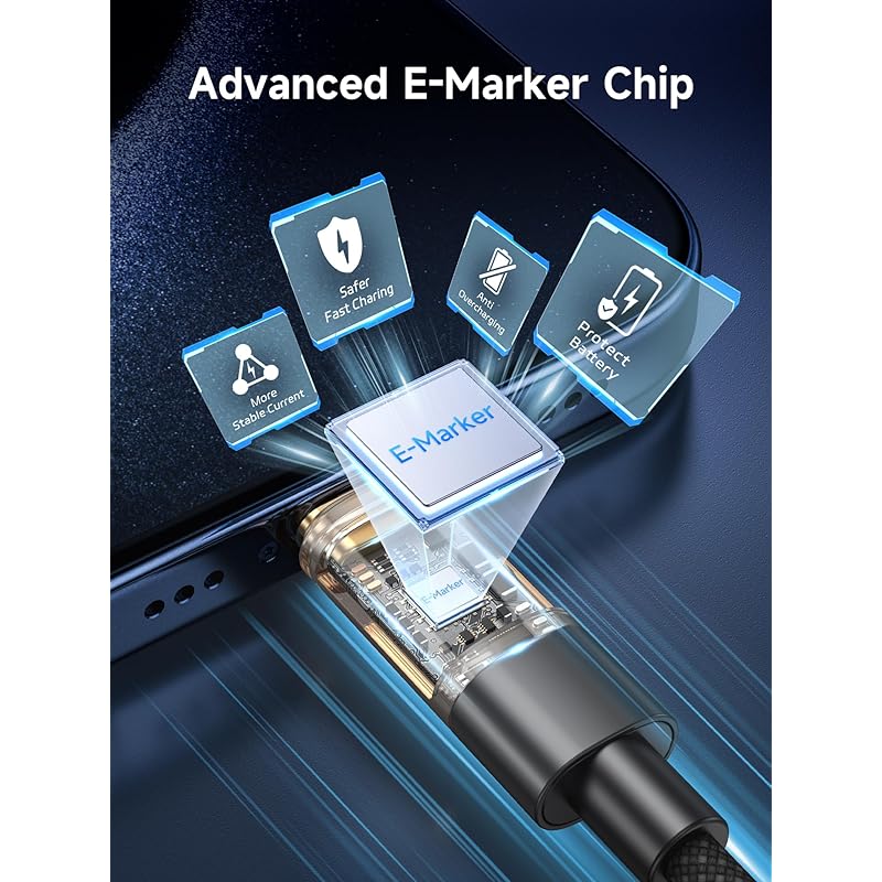 [Уникальный смарт-чип E-Marker] Кабель Type C - Type C длиной 0,5 м оснащен чипом E-marker, который автоматически регулирует мощность, чтобы предотвратить перегрев и перезарядку. Другими словами, кабель быстрой зарядки USB C мощностью 100 Вт явно более безопасный выбор, чем кабель зарядки C - C мощностью 60 Вт, и может лучше защитить ваше устройство и вас самих.